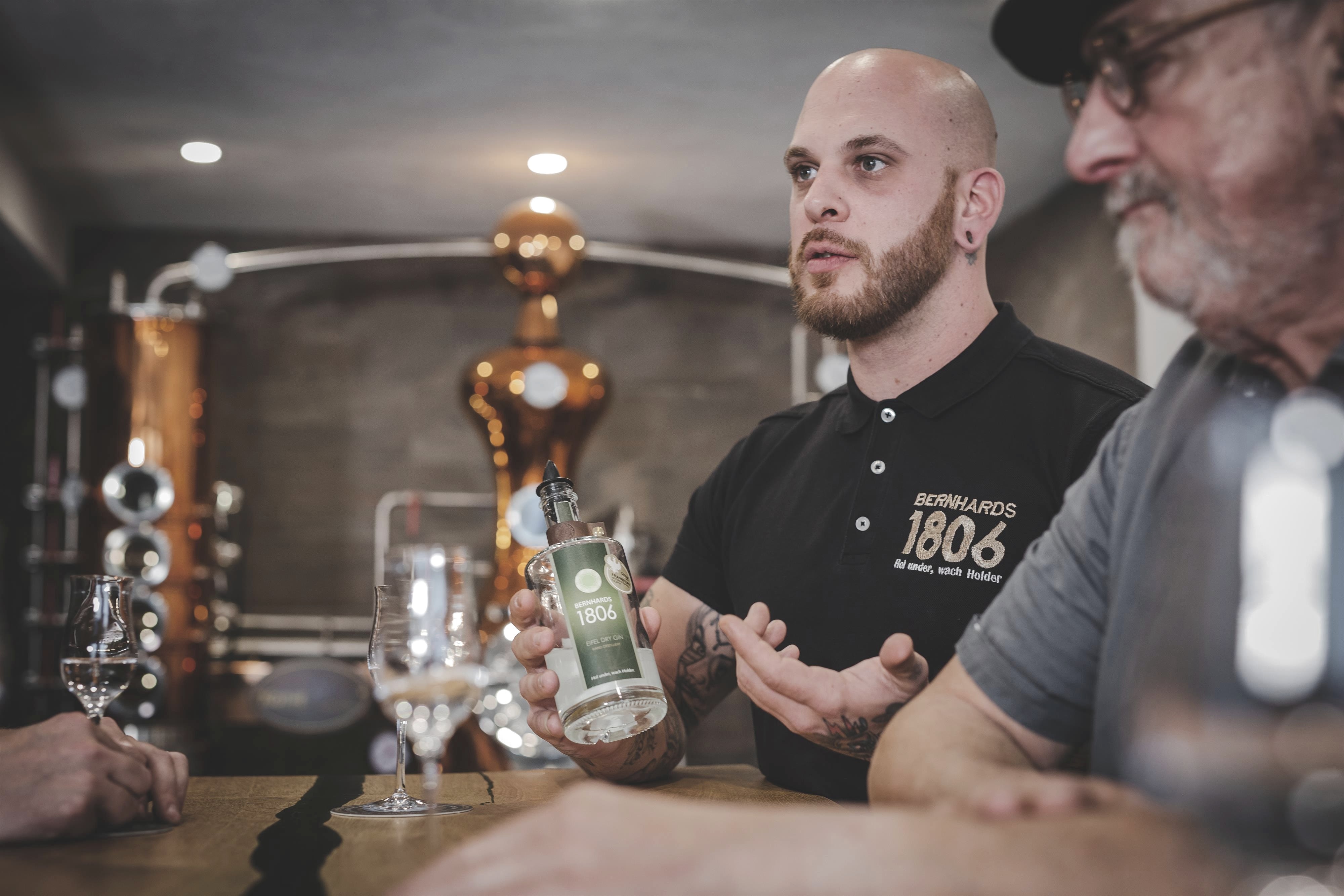 SMALL BATCH BERNHARDS 1806 vereint traditionelle Handarbeit und langjährige Erfahrung. Aus diesem Grund wird dieser besondere Gin auch nur in sehr kleinen Chargen einzeln von Hand abgefüllt und liebevoll mit einem geprägten Büffellederband veredelt. In limitierter Auflage - von Bernhard Zender persönlich handsigniert und nummeriert - wird somit jede einzelne Flasche BERNHARDS 1806 zum echten und wahren Unikat.