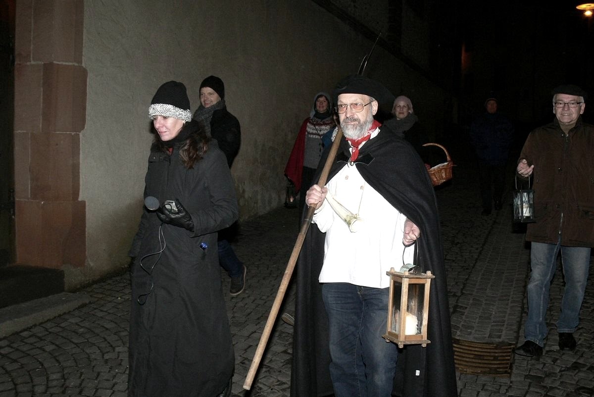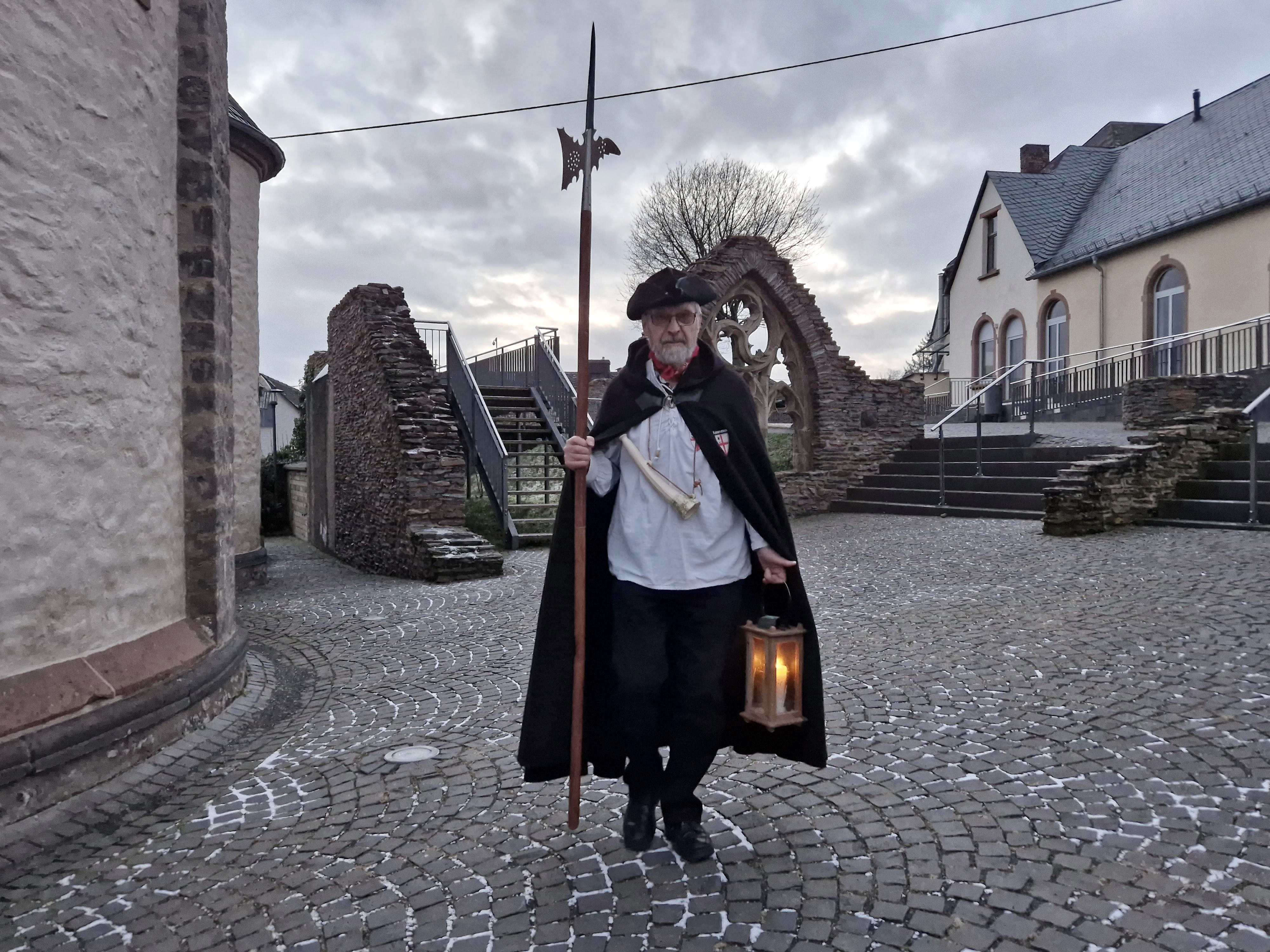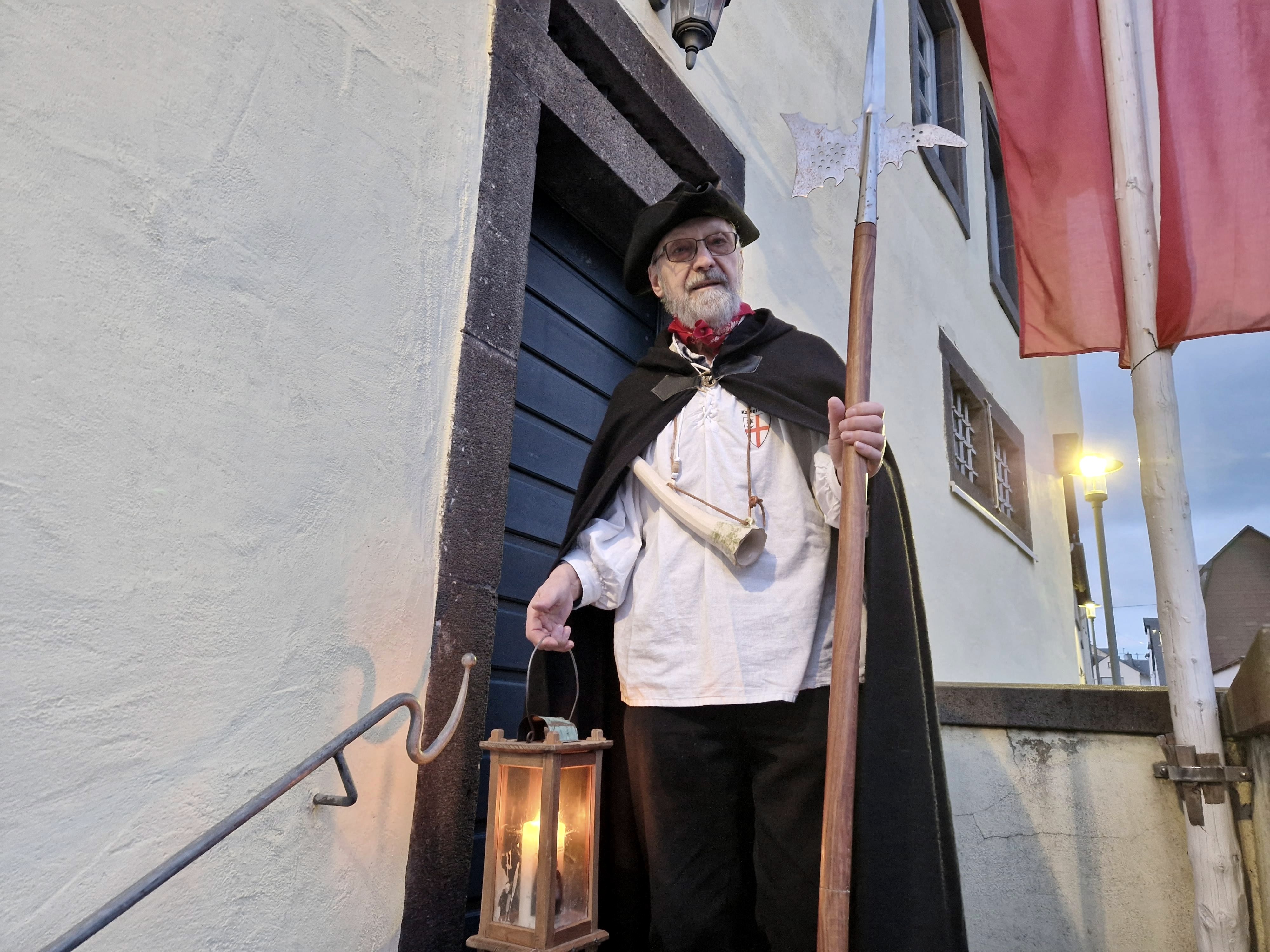 Jeden ersten Freitag im Monat greift der Kaisersescher Nachtwächter (Matthias Schnitzler) zu seiner Hellebarde, hängt sich das Signalhorn um und greift zur hölzernen Stalllaterne mit brennender Kerze.