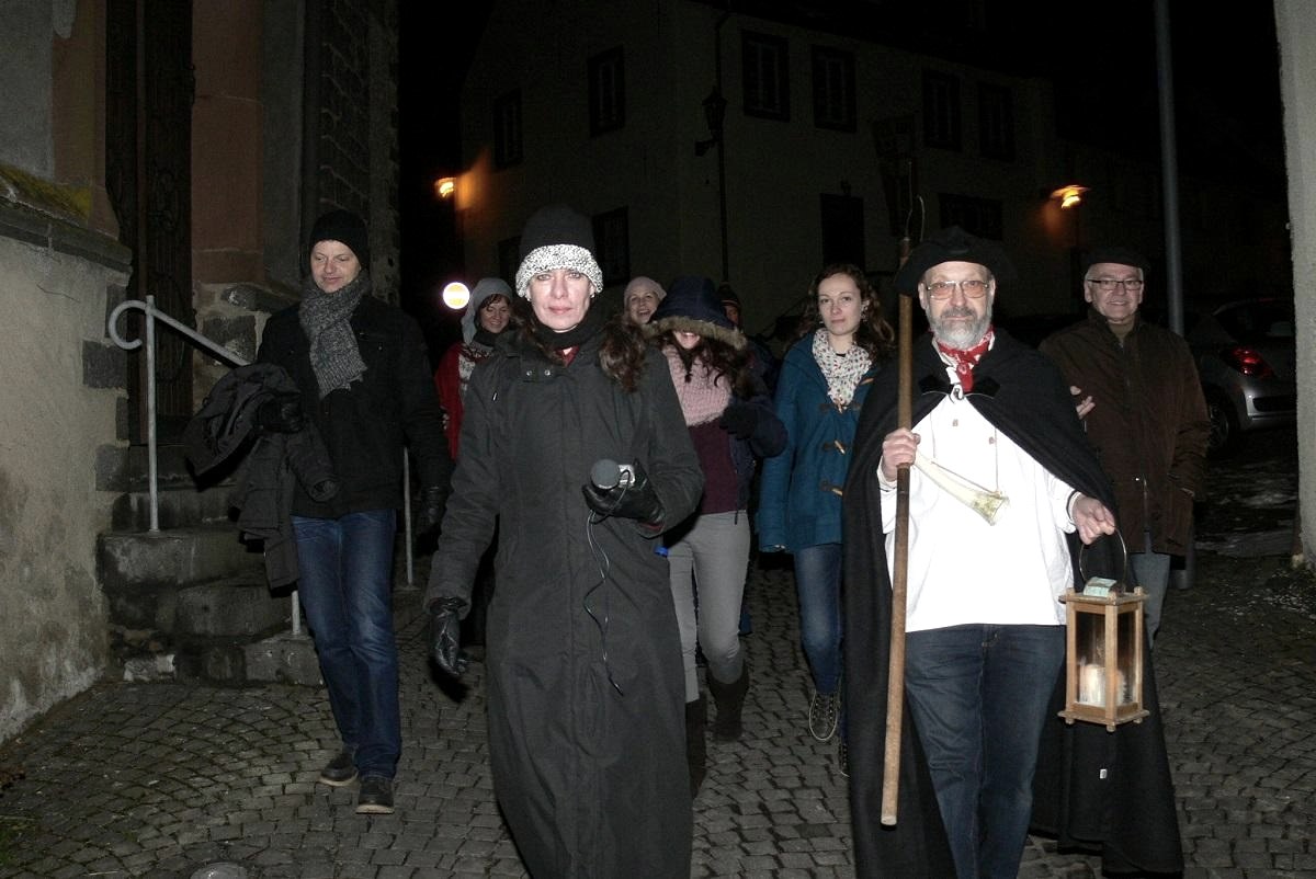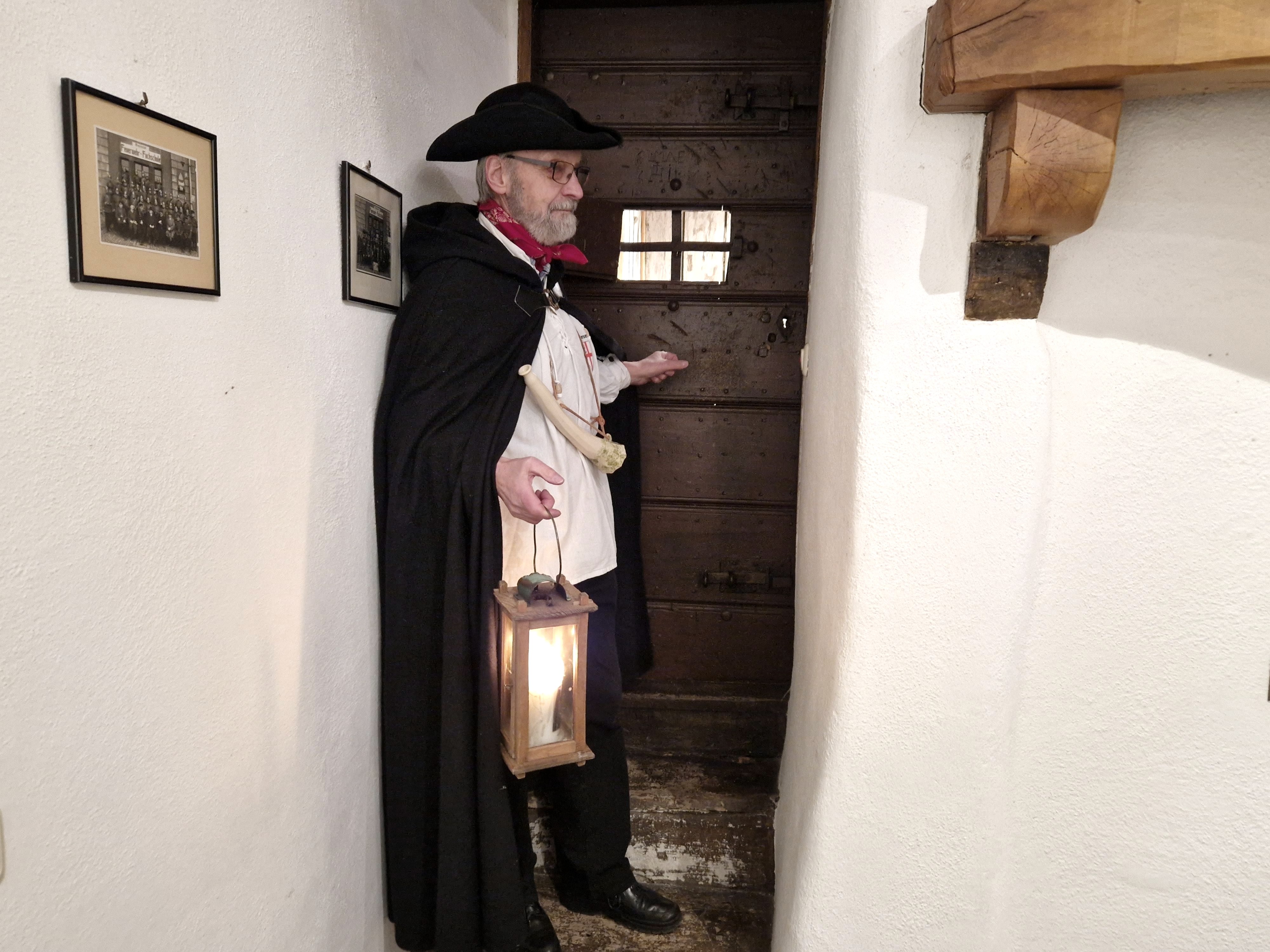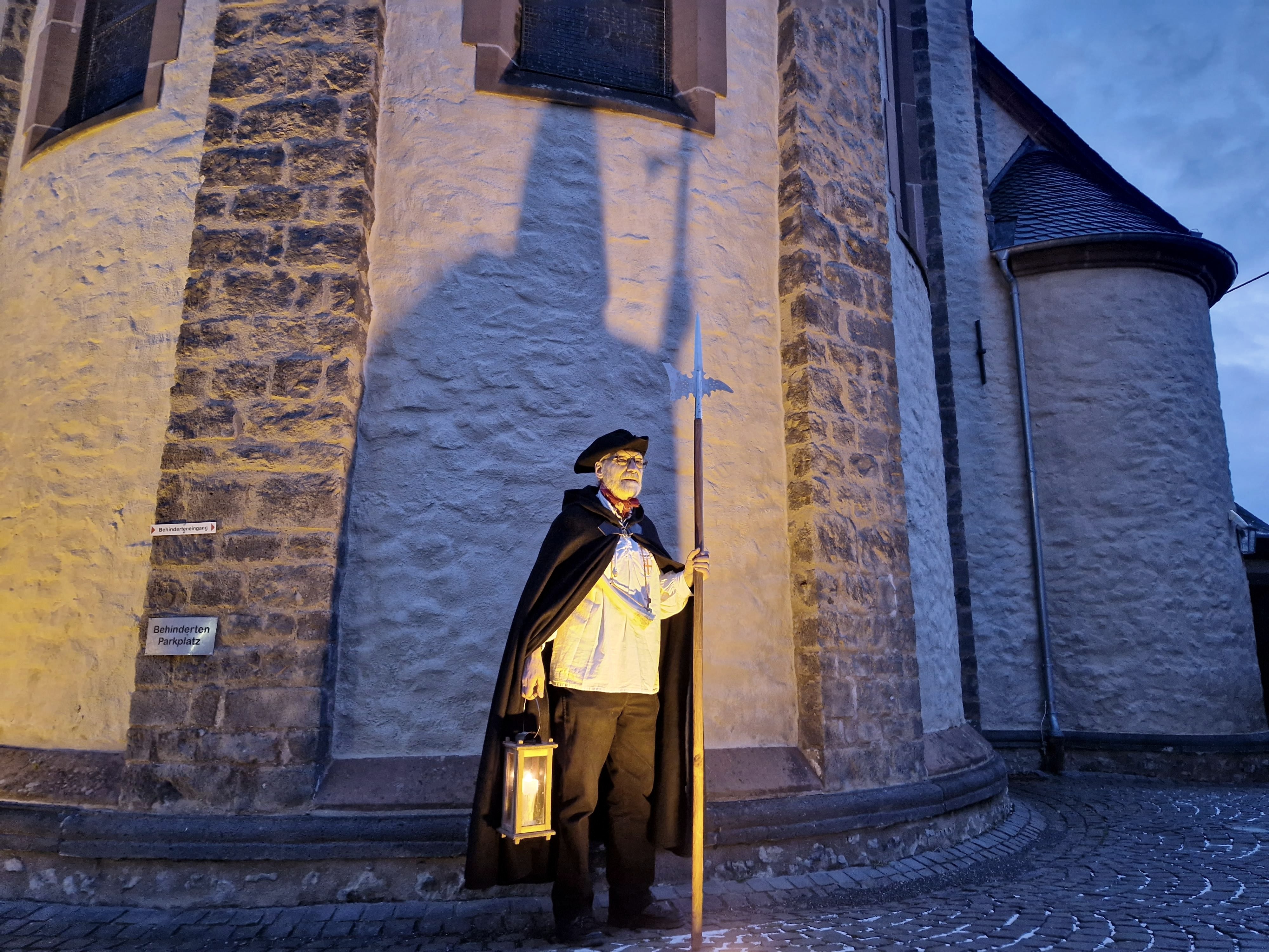 Jeden ersten Freitag im Monat greift der Kaisersescher Nachtwächter (Matthias Schnitzler) zu seiner Hellebarde, hängt sich das Signalhorn um und greift zur hölzernen Stalllaterne mit brennender Kerze.