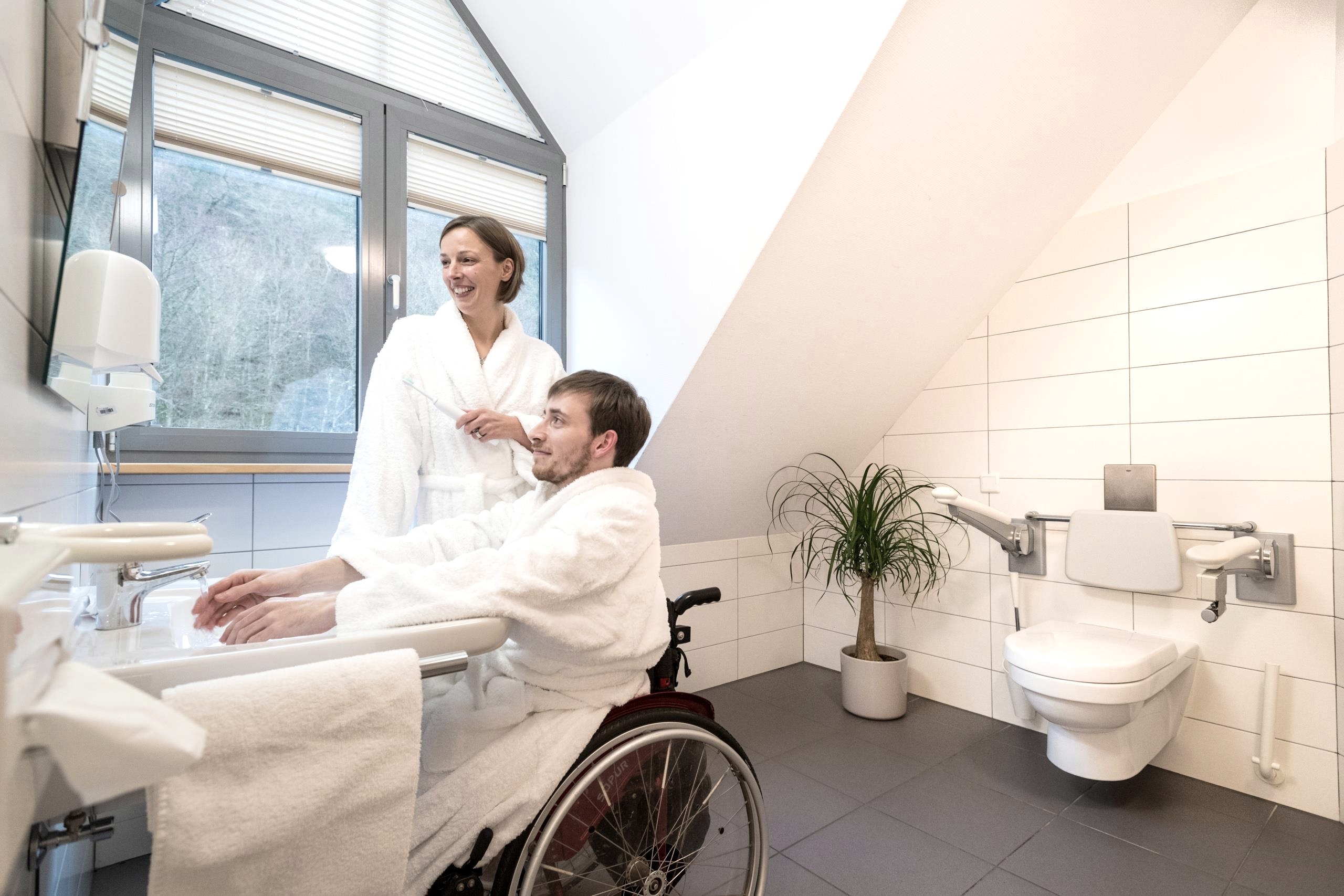 Unsere Ansprüche, unseren Gästen mit und ohne Behinderung einen Aufenthalt voller Ruhe und Entspannung zu verschaffen, sind sehr hoch. Darum wurde bereits bei der Erbauung eine behindertengerechte Ausstattung sichergestellt und umgesetzt. Wodurch ein barrierefreier Erholungsort geschaffen wurde, der über einen schönen und zugänglichen Außenbereich, Pflegebetten, mehrere Deckenlifter und ein mobiles Notrufsystem verfügt. Insgesamt bieten wir 26 Hotelzimmer an, von denen neun Zimmer für Rollstuhlfahrer geeignet sind und vier Zimmer für Gäste mit Gehbehinderung.