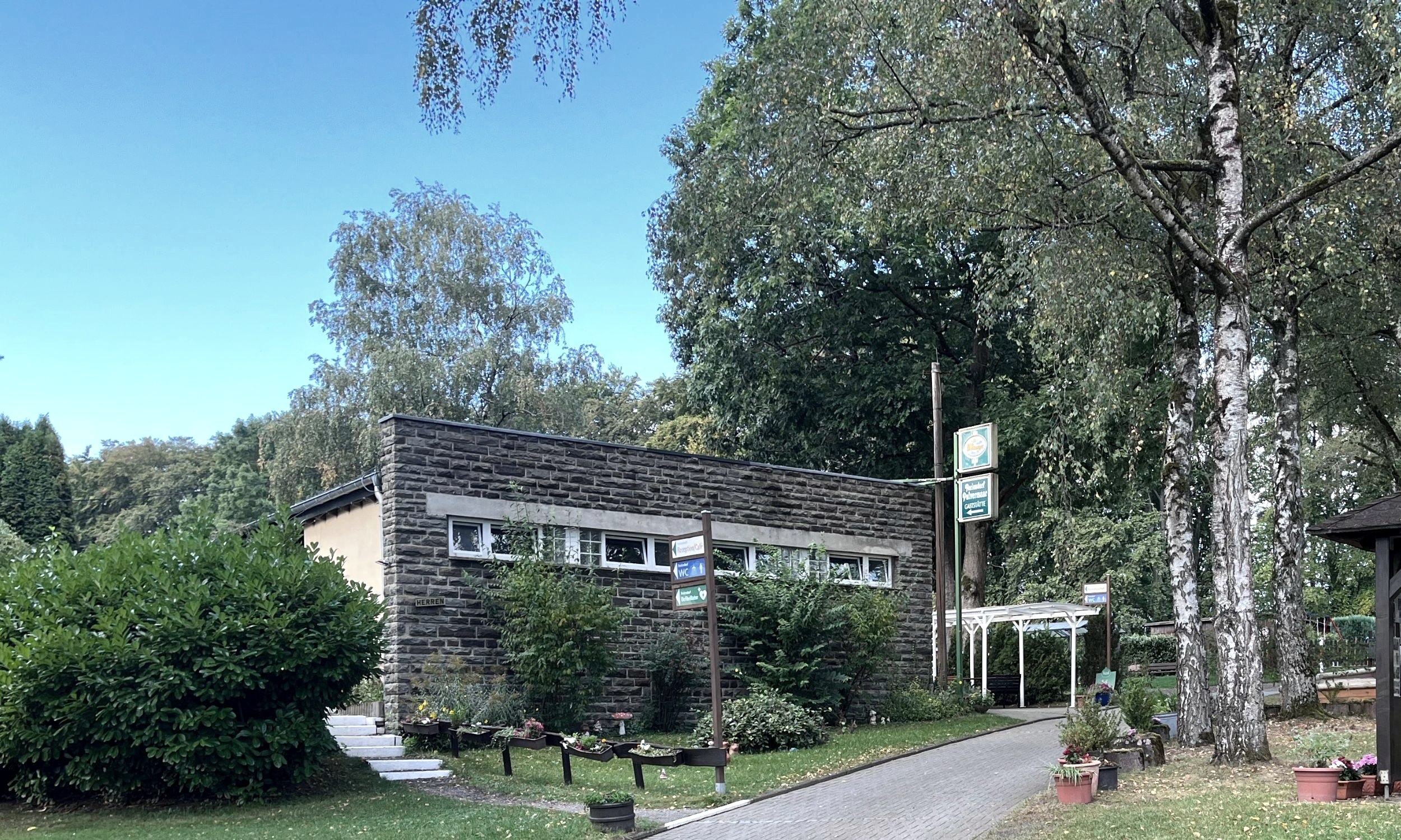 Im Gästehaus ist alles unter einem Dach vereint: Rezeption, Kiosk, Imbiss, Brötchenverkauf, Touristeninformation und WLAN-Hotspot. Zudem gibt es ein gemütliches Café mit Imbiss. Innen laden beheizte Sitzplätze zum Verweilen ein, während draußen eine große Terrasse zur Verfügung steht. Die Getränkekarte bietet allerlei Eifeler Spezialitäten, während auf der Speisekarte herzhafte Salate – auf Wunsch mit Fleischbeilage –, Kaffee und Kuchen vom lokalen Bäcker zu finden sind.