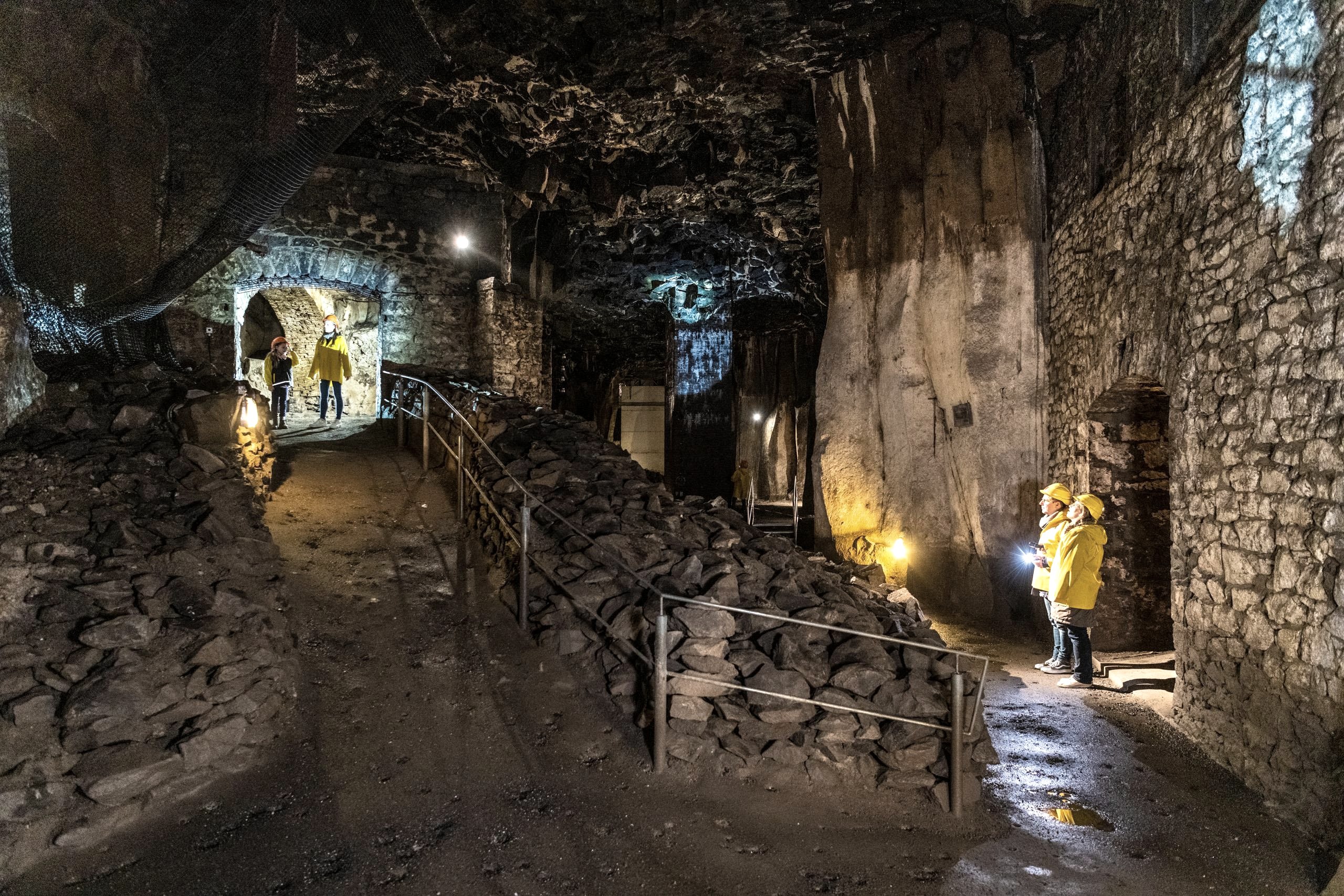 Es geht viele Treppenstufen tief hinab unter die Stadt Mendig: Hier in den Lavakellern, die in das erkaltete vulkanische Gestein hineingeschlagen wurden, ist es gleichbleibend kalt auch in den heißesten Sommern, es herrscht ein geheimnisvolles Schummerlicht, es riecht nach einem Hauch Feuchtigkeit.
