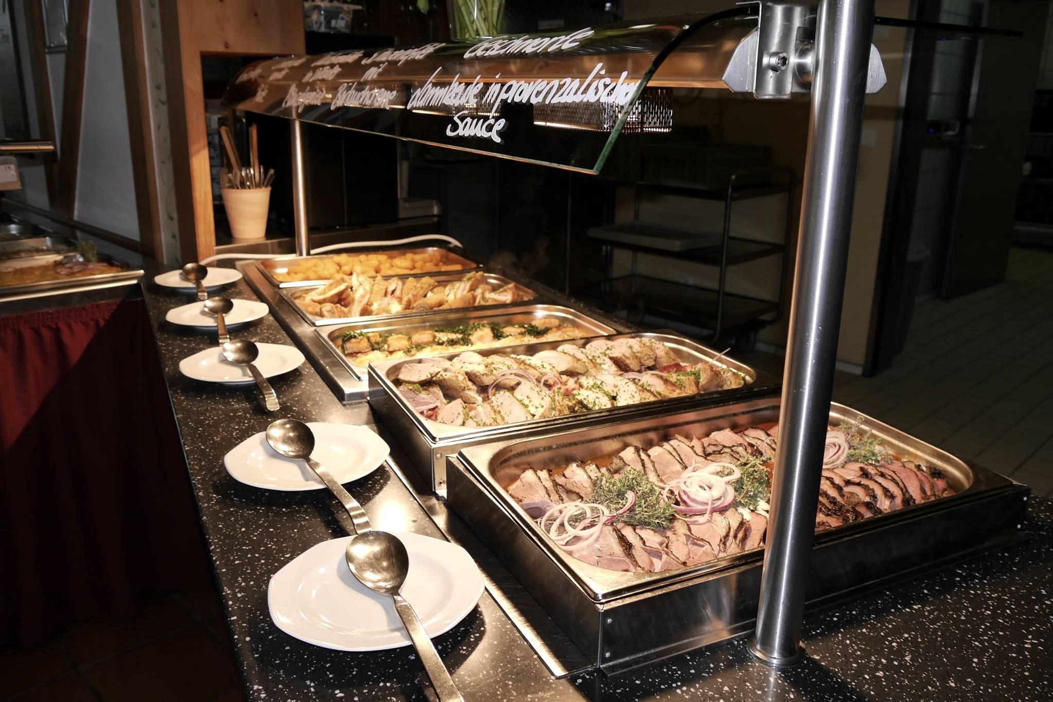 Freue dich auf frische Salate, wechselnde Suppen, Hauptgerichte mit Fleisch, Fisch und vegetarischen Optionen sowie ein Dessertbuffet mit Pudding, Joghurt, Gebäck, Eis und frischen Waffeln zum Selberbacken.