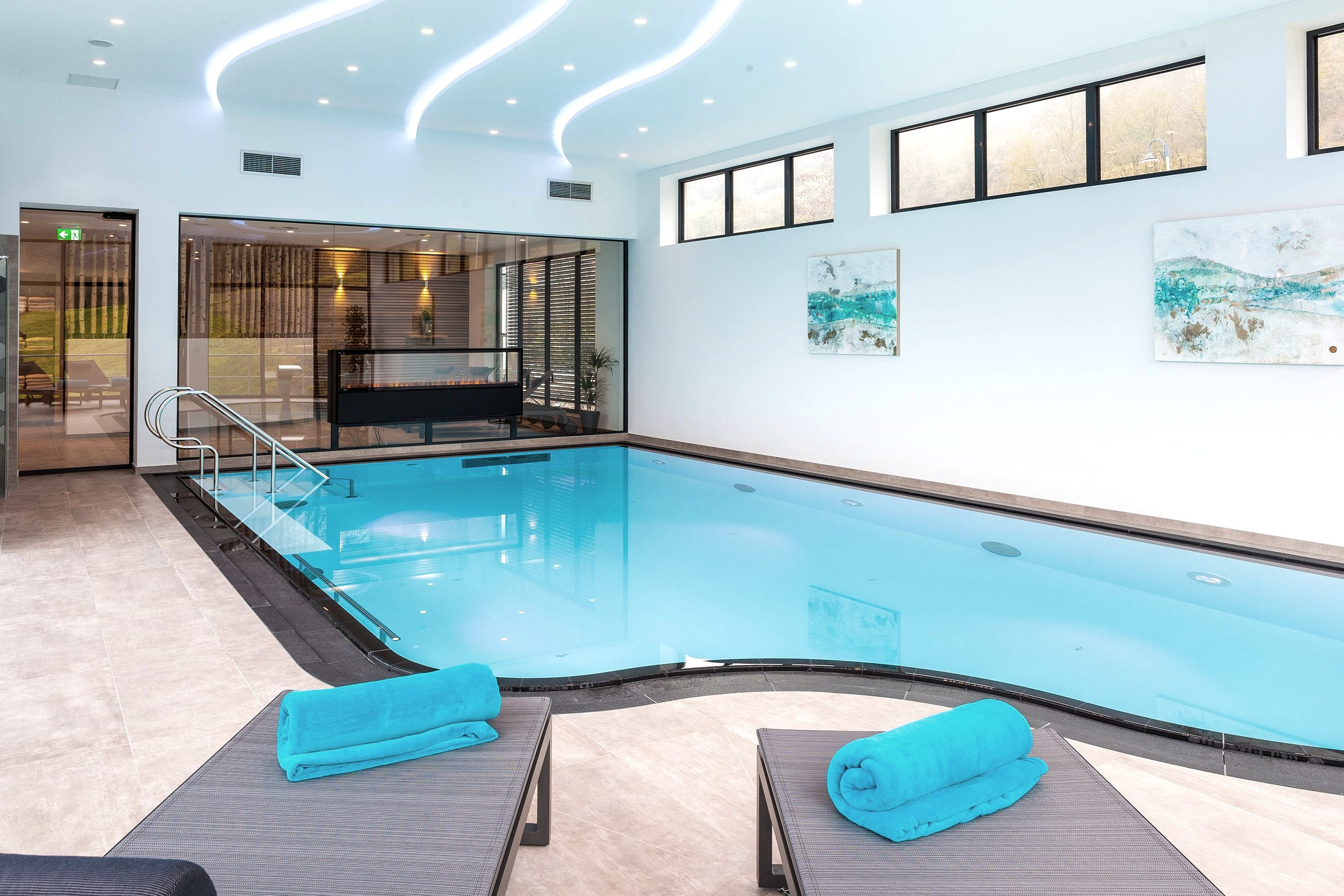 - Innenpool mit Gegenstromanlage, Massagedüsen und Whirlbank