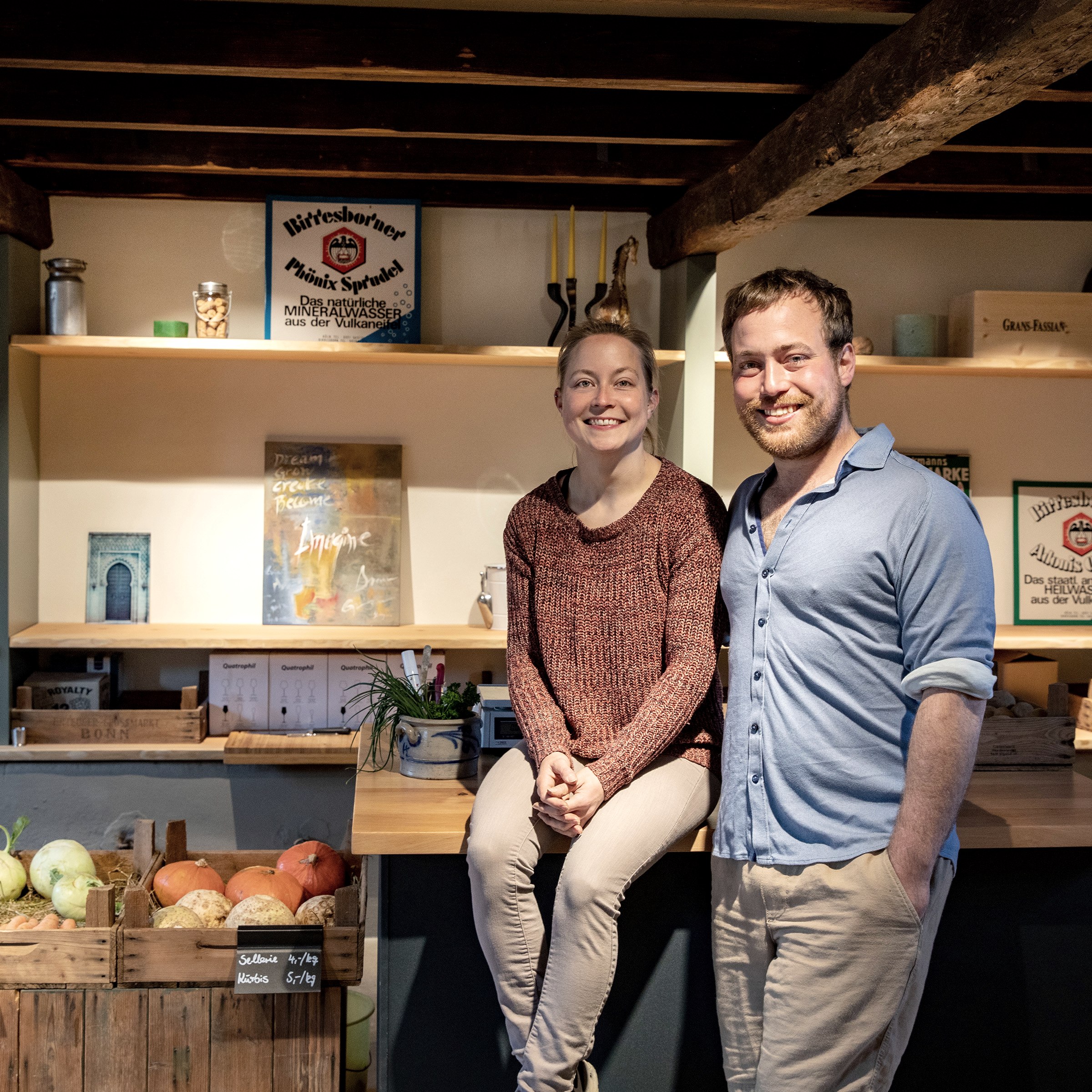 Zu jeder Flasche können die beiden Weinliebhaber eine Geschichte erzählen – schon stehen wir am späten Nachmittag, mit einem kühlen Glas Rosé aus der Pfalz in der Hand zusammen und prosten uns zu. Die Frühlingssonne scheint herein, Annas Eifelgarten ist weit mehr als nur ein Platz, an dem man frisches Gemüse einkaufen kann, hier trifft man Eifeler Überzeugungstäter*innen die auch Freude an einem Plausch mit ihren Kunden*innen haben. Schon dass Wort „Kund*in“ scheint hier nicht ganz stimmig: Die Menschen, die hier einkaufen sind mehr als das, irgendwie sind sie ein Teil vom Ganzen. Das liegt auch an der Offenheit der beiden Macher*innen.