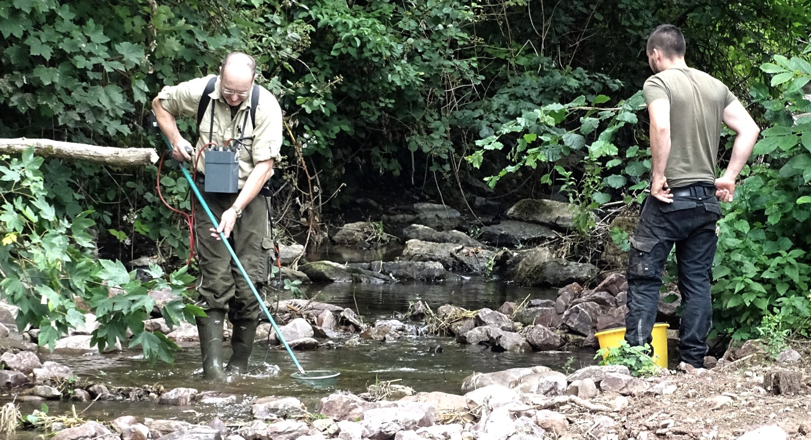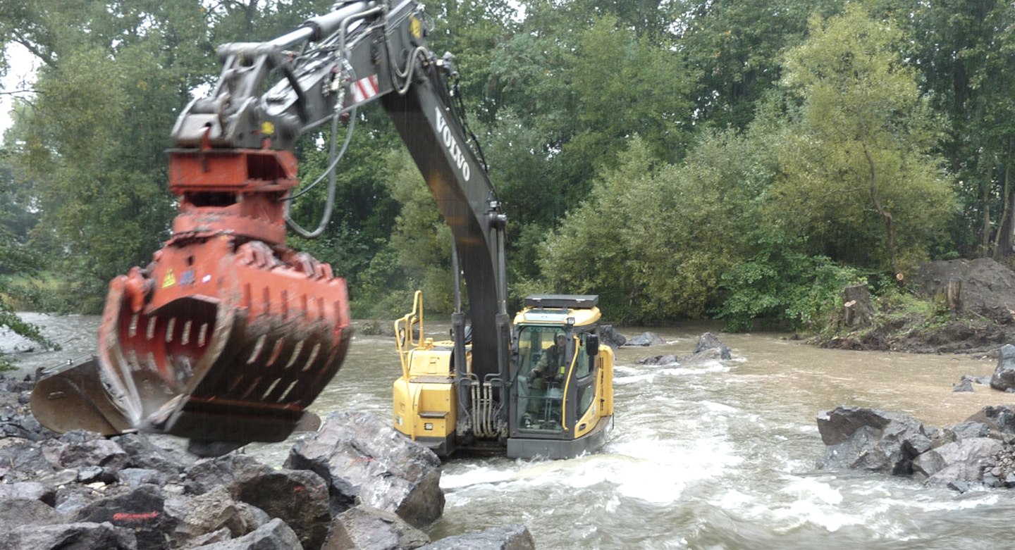 Der Umgang mit unseren Gewässern erfordert auch in der Eifel neue Denkweisen und Strategien. Starkregenereignisse und Flutkatastrophen einerseits sowie lange Dürrezeiten und absinkende Grundwasserspiegel andererseits verlangen einen nachhaltigeren Umgang mit Böden, Flüssen und Auenlandschaften als Pufferspeicher. Hierbei beraten die Gelderbloms betroffene Kommunen, private Bauherren sowie Land- und Forstwirte – sowohl in der Region aber auch im benachbarten NRW und Luxemburg. Manchmal helfen schon kleinere Maßnahmen, oftmals sind allerdings tiefgreifendere Konzepte notwendig, um beispielsweise ein begradigtes und verrohrtes Flussbett wieder in seinen natürlichen Ursprungsverlauf zurückzuversetzen. Immer wichtiger wird es, das Oberflächenwasser gleich vor Ort versickern zu lassen. Dann planen, gestalten und bauen die Gelderbloms auch schonmal naturnahe Schwimmteiche als Regenwasserrückhalt. „Wir müssen das Wasser in der Landschaft halten“, erläutert Katrin Gelderblom ihre Devise. Hierbei geht das Astakus-Team sehr sensibel vor und versucht, so behutsam wie möglich in die Natur einzugreifen. Jens Gelderblom sitzt meist selbst auf dem speziell ausgestatteten Bagger und achtet Meter für Meter auf den behutsamen Umgang innerhalb der bestehenden Lebensräume. Schließlich ist es ein großes Anliegen der Firmeninhaber, mit den wasserbaulichen Maßnahmen gleichzeitig wertvolle Ökosysteme für Tiere und Pflanzen zu erschaffen. Bei Fließgewässern ist es für Jens Gelderblom wichtig, die Durchgängigkeit für Fische wieder herzustellen. Gemeint ist damit, dass die Fische die Flüsse und Bäche ohne Barrieren durchwandern und so ihre überlebenswichtigen Habitate erreichen können.