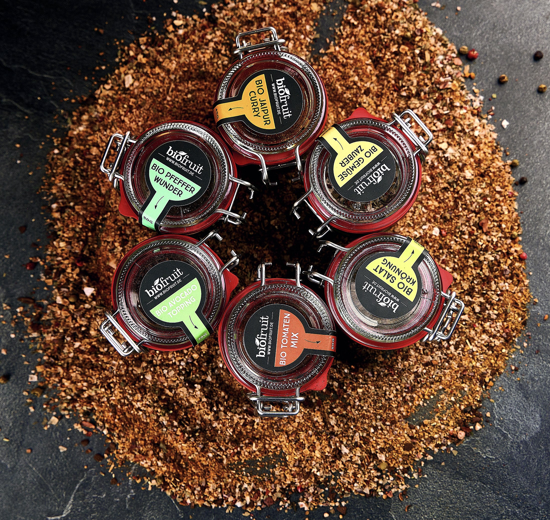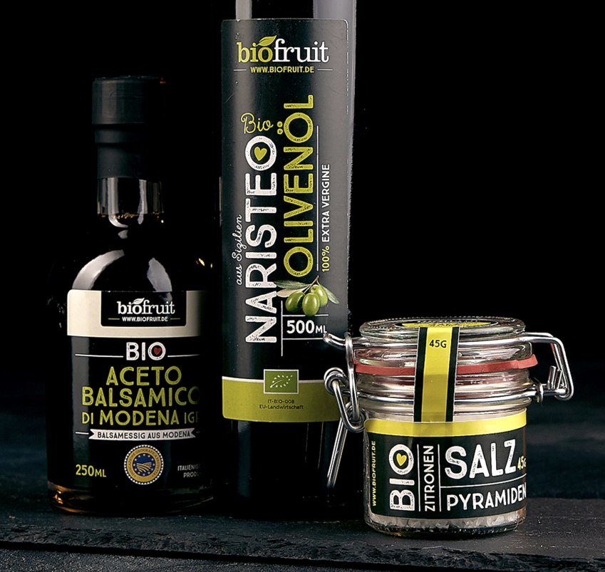 Seit ein paar Jahren hat Dirk Salentin das Obst- und Gemüseangebot um Biogewürzmischungen sowie ein feines Olivenöl aus Sizilien und Essigmischungen erweitert. Gewürz-Mischungen wie Avocado-Topping, Pfeffer-Wunder, Gemüsezauber oder eine Salat-Krönung werden im Handel und über den online-Shop von biofruit angeboten. Die Rohstoffe sind natürlich nach den gleichen strengen ökologischen Kriterien wie beim frischen Sortiment angebaut.