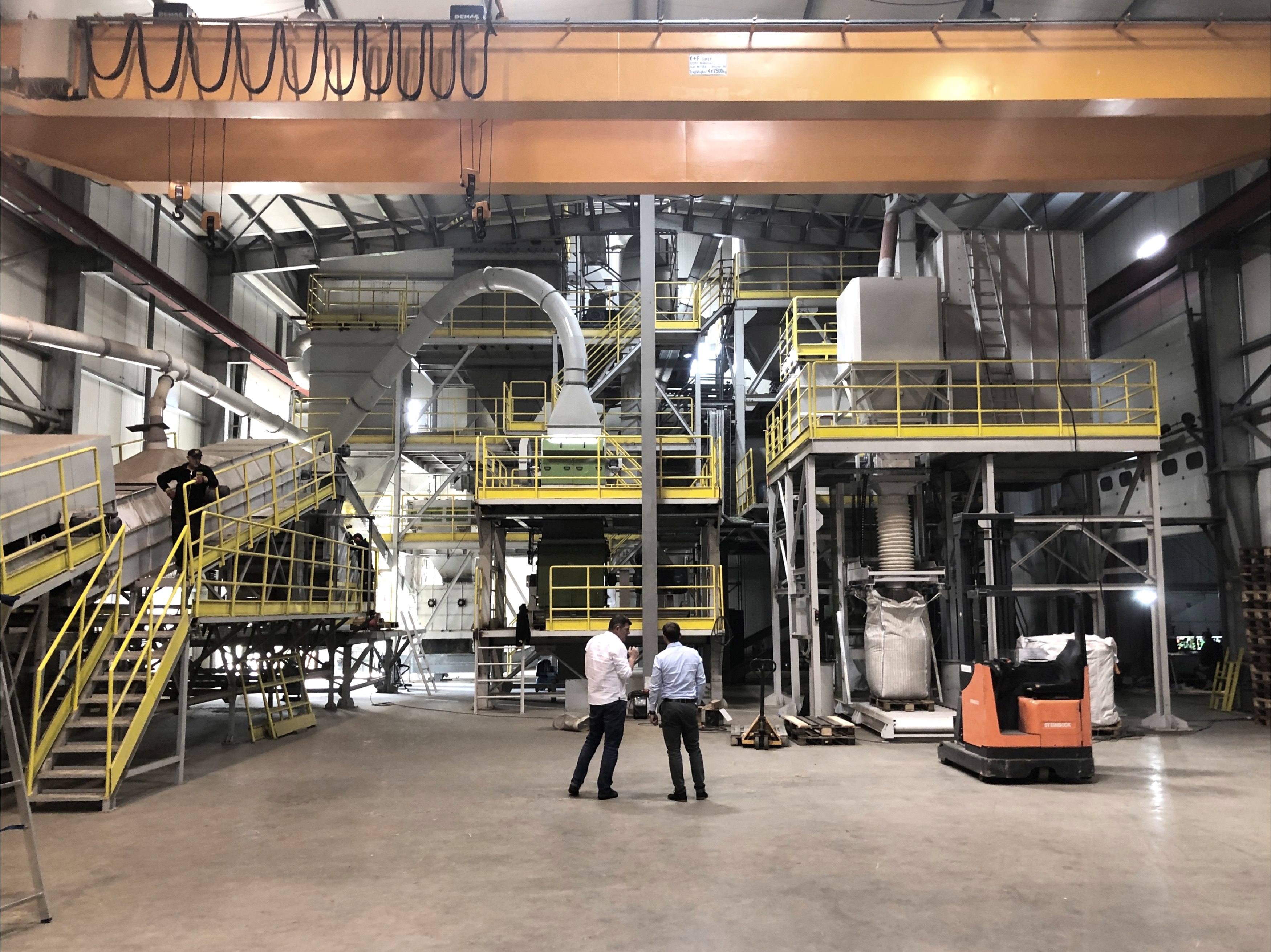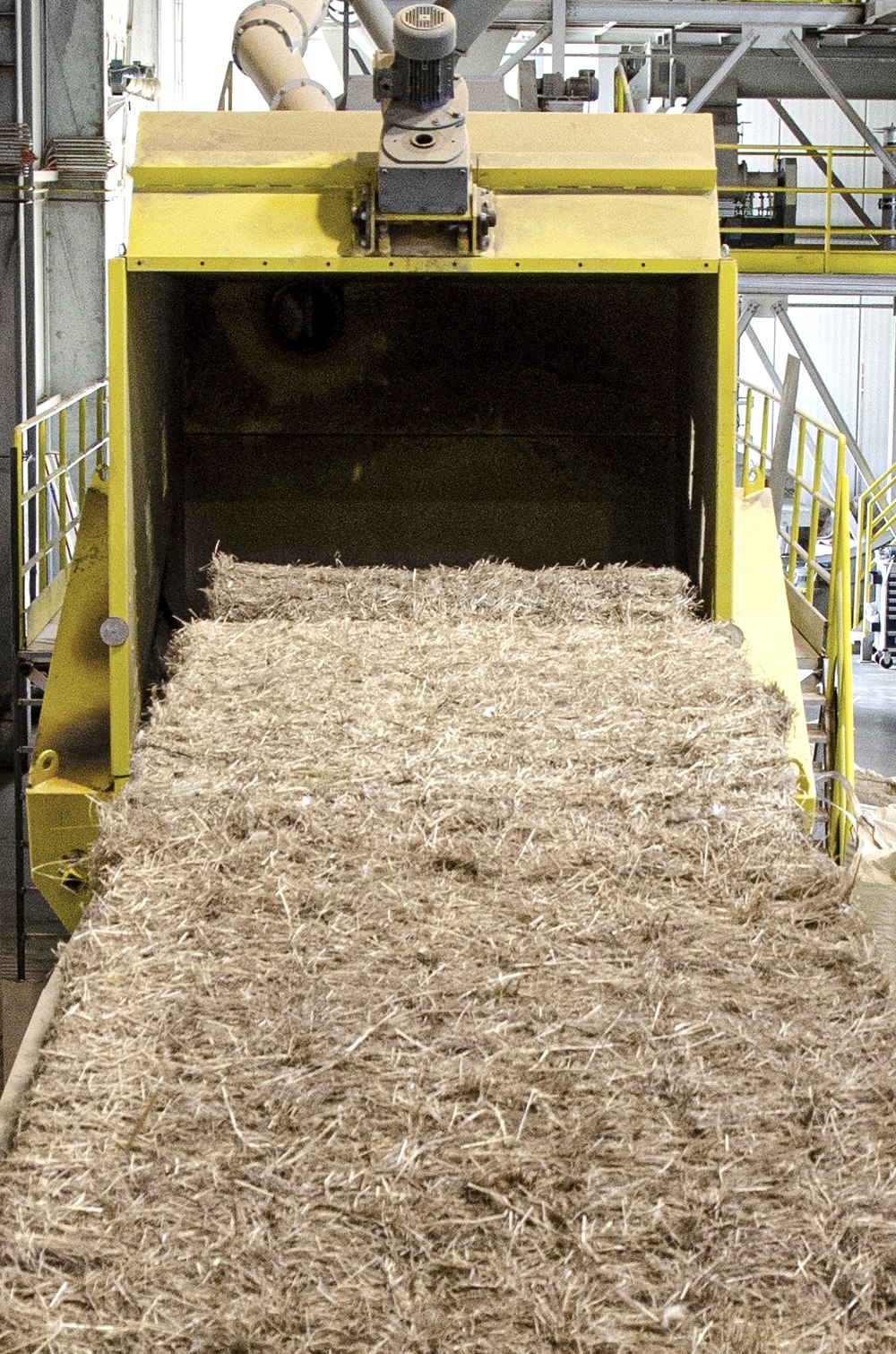 Im Werk in Düren wird das Heu, das zu einem Großteil aus der Eifel kommt, als gepresste Strohballen angeliefert. Danach wird geschnitten, gefiltert, getrocknet, gemahlen und am Ende werden die Fasern zu Pellets gepresst. Diese können ohne weitere Anpassung in den Papierfabriken genutzt werden.