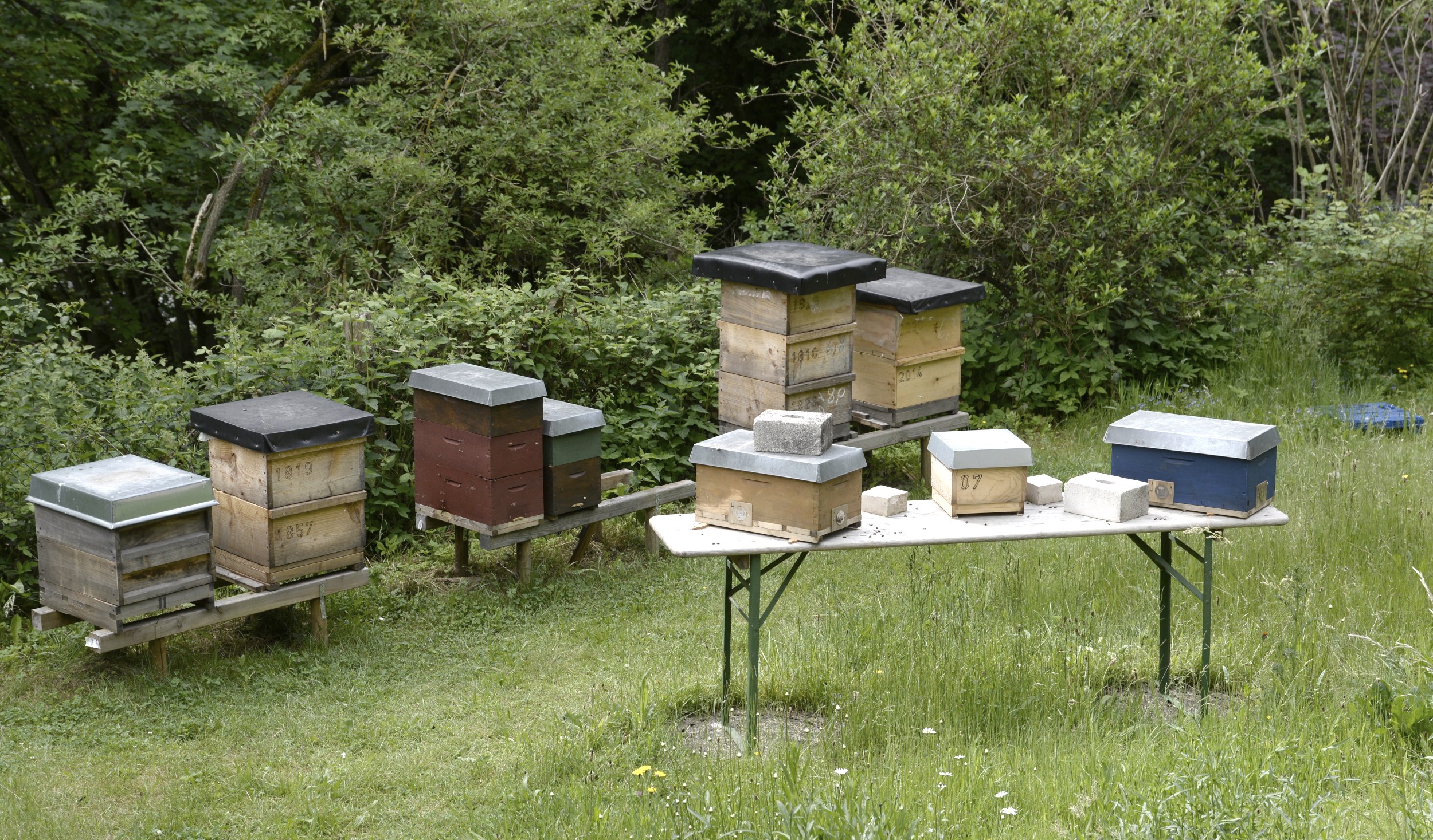 Seit rund 2 Millionen Jahren sei diese Art etabliert, erzählt der Imker. Und er hat noch ein paar weitere, spannende Fakten parat: Im Brutnest herrschen konstant 35 Grad Celcius – mit geringen Schwankungen, damit es schön kuschelig bleibt. Doch selbst im Winter schaffen es die Bienen, die Temperaturen in ihrem Stock auf mindestens 20 Grad Celsius zu halten, selbst bei starken Minusgraden. 8.000 bis 10.000 Bienen leben im Winter immerhin noch im Stock, im Sommer werden es dann bis zu 50.000. Die Königinnen leben übrigens bis zu fünf Jahre. Die Winterbienen dagegen nur etwa 8 Monate, die Sommerbienen 3 bis 4 Wochen und die Drohnen – nun, sie schlüpfen im Mai und haben nur eine Aufgabe: zu befruchten, danach sterben sie sofort. 5.000 bis 6.000 Drohnen bringt ein Bienenvolk etwa hervor, die restlichen Bienen im Volk sind Arbeiterbienen, die unermüdlich auf der Suche nach Futter sind oder im Stock die Königin versorgen.