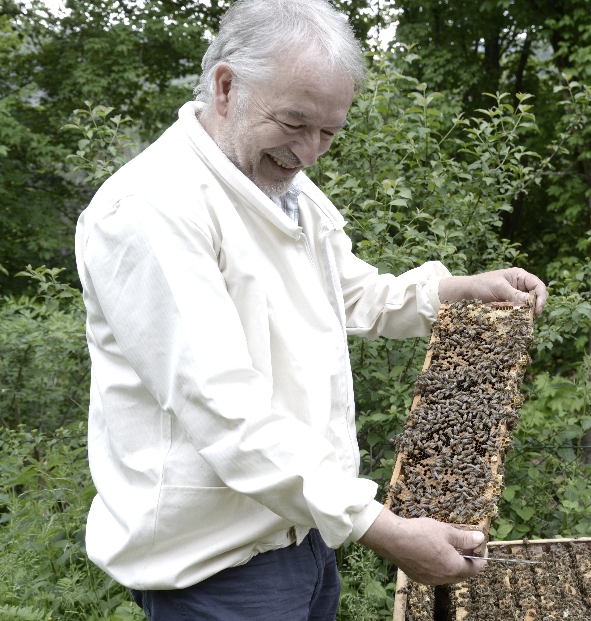 Ruhig und gelassen steht Friedrich Bleckmann in seinem Garten in Schleiden an einem der Bienenstöcke und öffnet ihn. Schutzkleidung trägt er nicht, die Bienen seien sehr friedlich, erklärt er und nimmt vorsichtig eine der Waben aus dem Kasten und hält sie in Richtung Kamera. Für den Laien scheint es ein chaotisches Gewusel zu sein, was sich in einem Bienenstock abspielt, doch tatsächlich weiß jede Biene ganz genau, was sie zu tun hat. „Bienen sind so intelligent und flexibel. Sie fügen sich unglaublich gut in die Natur ein und können sich hervorragend anpassen“, erklärt Bleckmann seine Faszination für die Honigbienen.