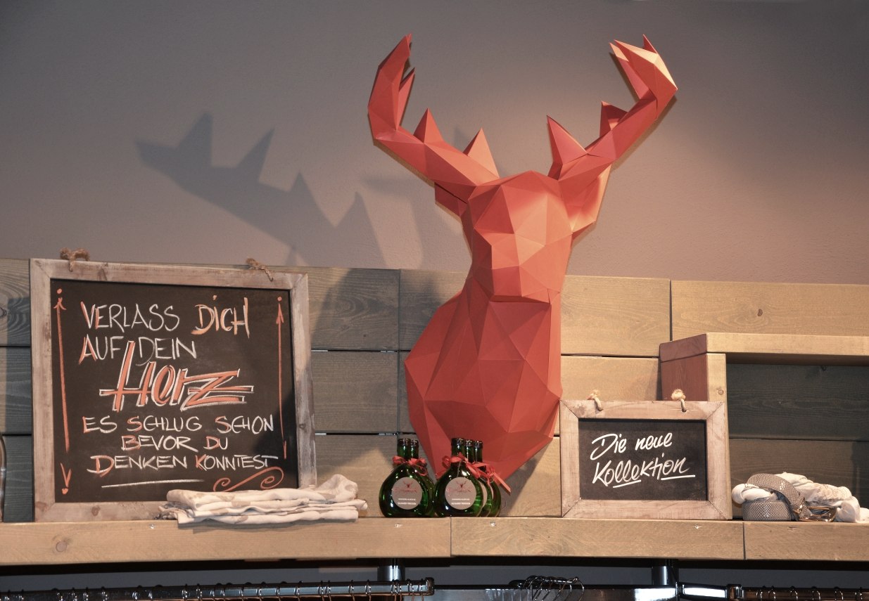 Viele Produkte und Dienstleister möchten gerne als ‚Marke’ etabliert sein – vielen gelingt es nicht. ‚Eifelglück‘ dagegen hat als Marke eine unverwechselbare Persönlichkeit. Es gibt keine Franchise-Verwässerung und keine anderen Standorte. Das Geweih als Logo fällt auf, und die Idee eines qualitativ hochstehenden Warenangebotes mit einem klaren Bezug zur Region wurde konsequent verfolgt. Hinzu kommt, dass man den ‚spirit‘ spürt, der die beiden Inhaber antreibt: Die Zugehörigkeit zur Intersport-Genossenschaft erkennt man als Kunde nicht mehr, sondern dieses Geschäft wurde – bis hin zu den Holzvisitenkarten – ganz individuell mit Naturmaterialien gebrandet und bleibt ständig in kreativer Bewegung. Angelika Pfister zum Konzept: „Alles hier ist einzigartig. Die Einrichtung und die Dekoration sind zusammen mit uns entworfen und speziell für uns angefertigt worden. Und wenn einer den Sessel oder den Korb oder andere Dekorationselemente unbedingt kaufen will, dann ist das kein Problem. Wir können immer mit neuen Ideen nachlegen.“