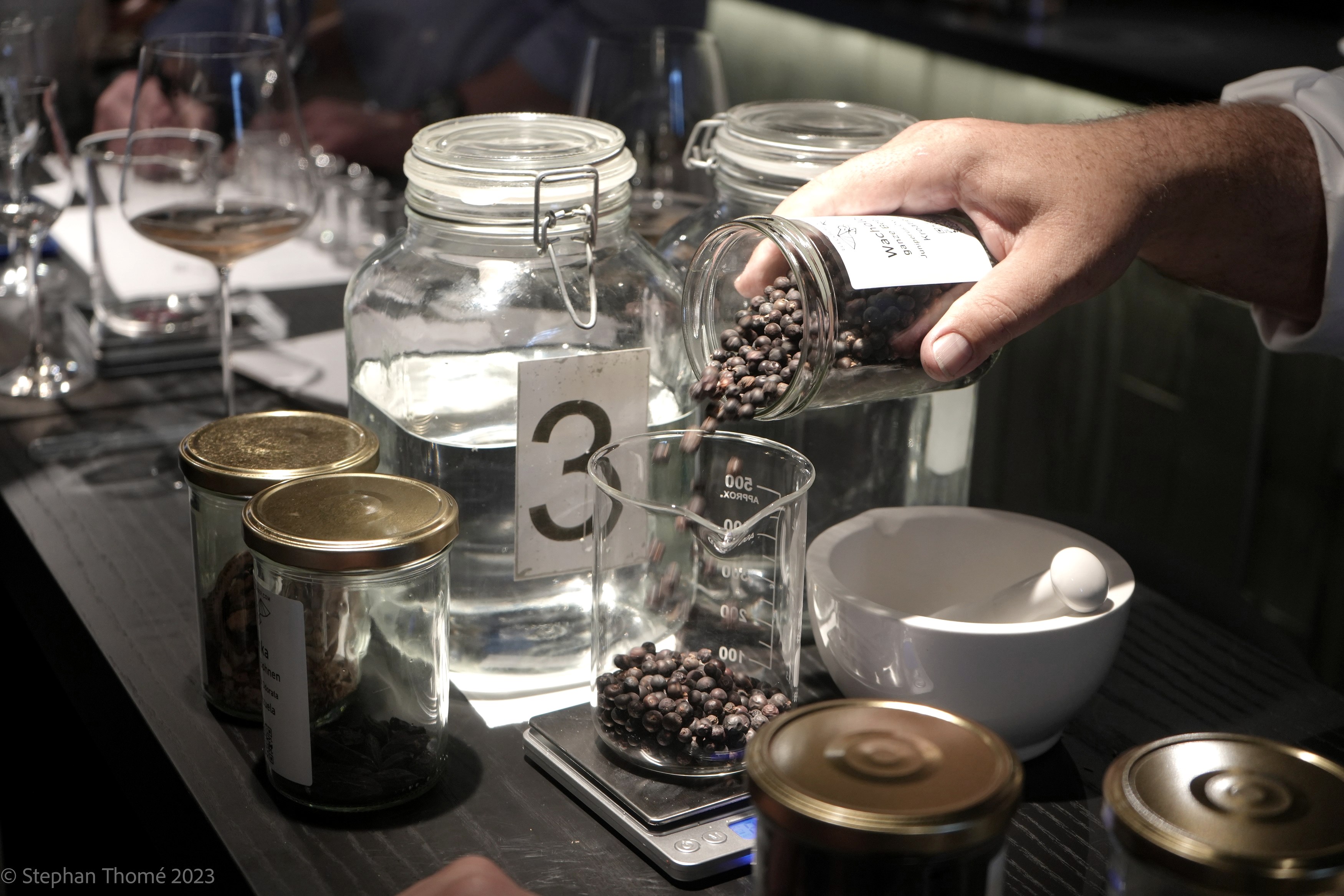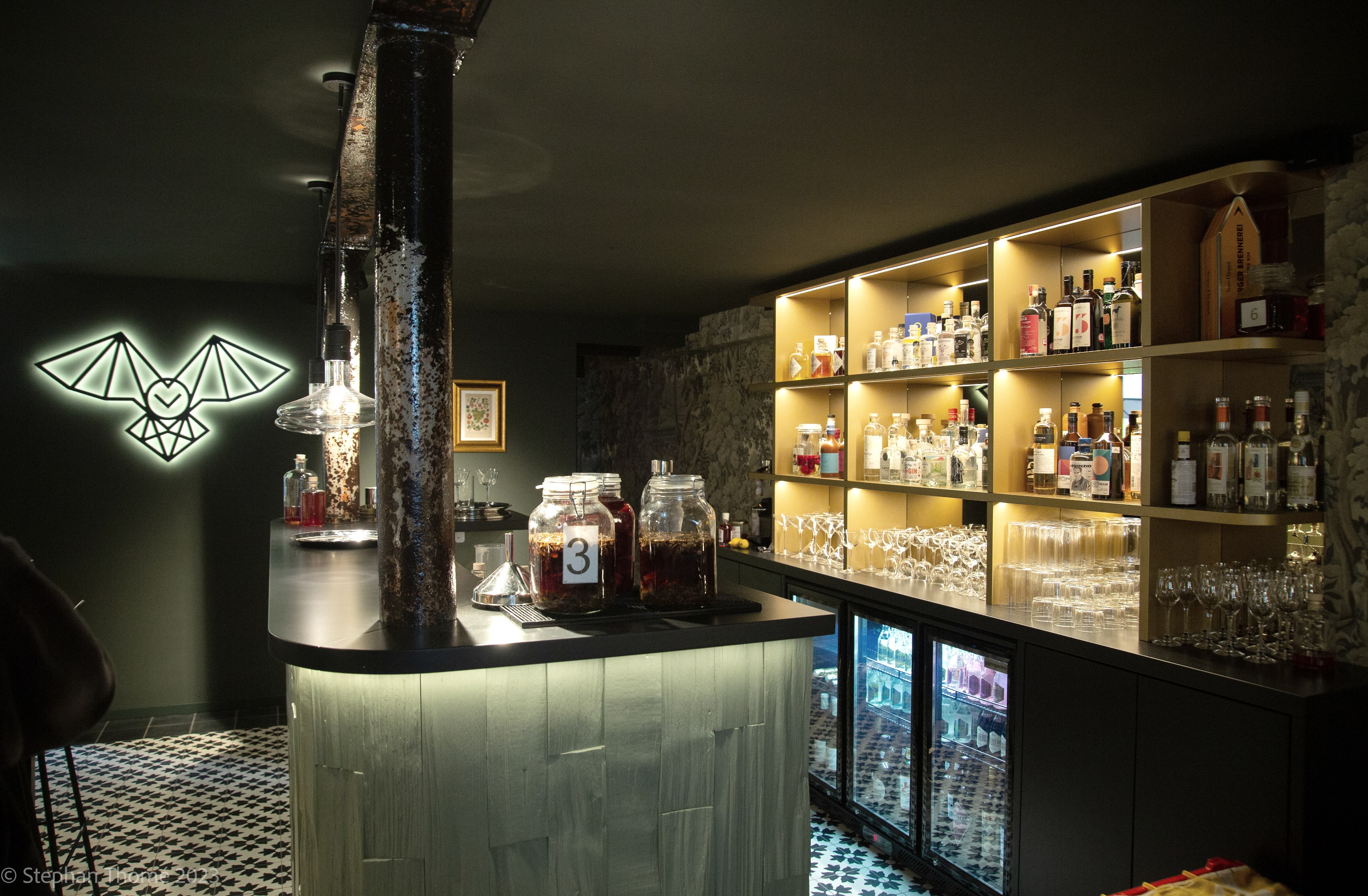 Auf dem Familienhof in Dingdorf hat Thomé die Brennerei im Jahr 2020 eingerichtet, zunächst als Hobby. Zusammen mit seiner Ehefrau war er aus Berlin zurückgekommen, um in der Eifel eine gute Work-Life-Balance und ein intakteres Umfeld zu finden. Doch schon drei Jahre später war aus dem Hobby nicht nur eine echte Passion, sondern ein Hauptberuf geworden. Dabei ist die ländliche Lage des Lebens- und Arbeitsmittelpunktes ein Plus: „Wir produzieren hier zwischen den Metropolen Brüssel, Köln und Paris, das ist für die Kontakte in die Spitzengastronomie hervorragend“, schildert er den Vorteil. Der eigene Online-Shop, in dem auch Honig, Brände und Liköre vertrieben werden, funktioniert vom Eifeldorf aus ebenfalls hervorragend. Ein Magnet ist die Idylle sogar für die Besucher der Tastings und der Gin-Schule, die direkt neben der Brennerei in einem Hofteil eingerichtet wurde. Das Design der edel ausgestatteten Location wurde von einem Familienmitglied gestaltet. Im Mittelpunkt steht immer die stilisierte Eule, das Logo der Euelsberger Brennerei. „Auf dem Berg gibt es tatsächlich Eulen“, stellt Thomé den urwüchsigen Naturbezug her.