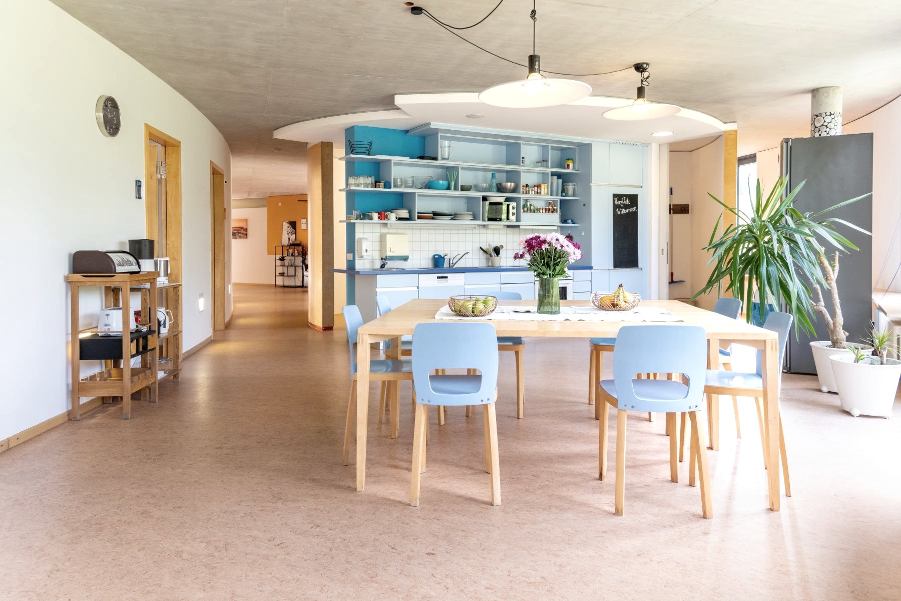 Das großzügige Gelände ist umringt von viel Grün, idyllisch gestaltet mit prachtvollen Beeten und einem großen Fischteich. Hier schmiegen sich Schule, Ausbildungsgebäude, Wohnhäuser, Sporthalle und Außen-Aufenthaltsflächen harmonisch in die Landschaft. Alles ist mit allem verwoben – sowohl auf dem Campus als auch im Ausbildungs- und Betreuungskonzept des Bildungswerkes. Die Auszubildenden leben in Wohngruppen, haben in einem der demnächst 5 Gebäuden ein eigenes Zimmer und gemeinschaftliche Aufenthaltsräume, Küche und Bäder. Jede Gruppe wird begleitet von einem Wohngruppenbetreuer, der auch dafür sorgt, dass die jungen Leute sich möglichst selbstbestimmt organisieren und für den gemeinsamen Haushalt sorgen. Das Mittagessen gibt es in der Mensa, doch für Frühstück, Abendessen und Wochenendverpflegung sind die Wohngruppen jeweils selbst verantwortlich. Zur Gestaltung der persönlichen Freizeit steht den ca. 250 Teilnehmenden ein Freizeithaus mit großer Sporthalle sowie Räumen für Musik, Entspannung oder kreativen Hobbys zur Verfügung.