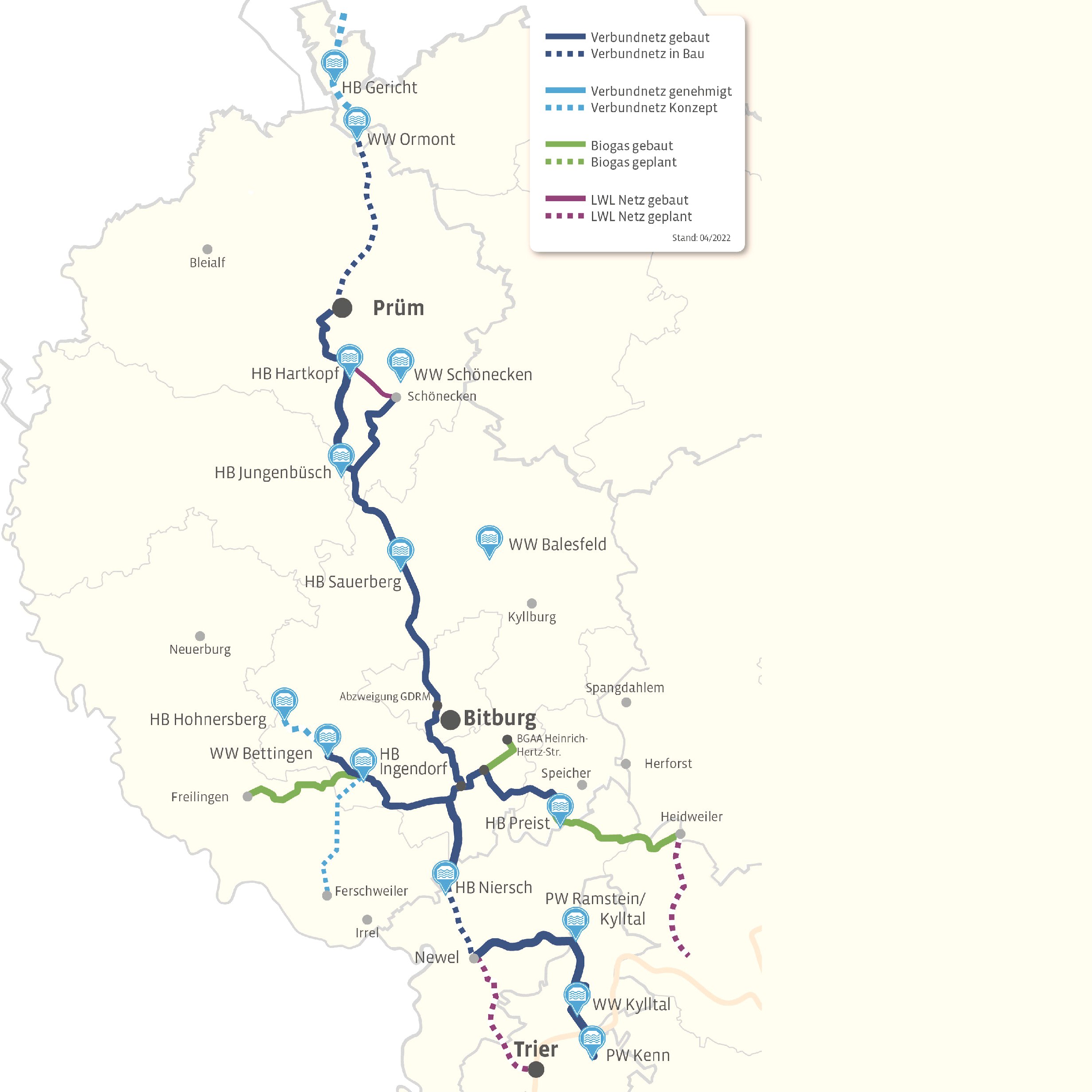 Im Rahmen des Projekts haben die Anteilseigner der Biogaspartner Bitburg GmbH (SWT Stadtwerke Trier Versorgungs-GmbH, Entsorgungsbetrieb Luzia Francois GmbH und KNE) in der Nähe des Bitburger Flugplatzes eine Biogas-Aufbereitungsanlage mitsamt Speicher gebaut und sieben vorhandene Biogasanlagen durch eine 45 km lange Leitung vernetzt. Seit dem Sommer 2020 produziert die Anlage regionales Bio-Methan, das vor Ort in das bereits vorhandene Erdgasnetz eingespeist wird. „Damit verdrängen wir fossiles Importgas und reduzieren den CO2-Ausstoß“, erläutert SWT-Vorstand Müller. Den Betreibern der Biogasanlagen sichert die neue Verwendung des Biogases eine wirtschaftliche Perspektive nach der EEG-Förderung. Ähnliche Projekte sind auch in der Eifel und im Hunsrück in Planung. „Perspektivisch könnten wir mit einer Wasserstoffproduktion aus erneuerbarem Überschussstrom und dem beim Aufbereitungsprozess aus dem Biogas abgespaltenen CO2 die eingespeiste Methanmenge nahezu verdoppeln und die erneuerbare Energie aus den Sommermonaten für den Winter einspeichern“, erklärt SWT-Vorstand Müller.
