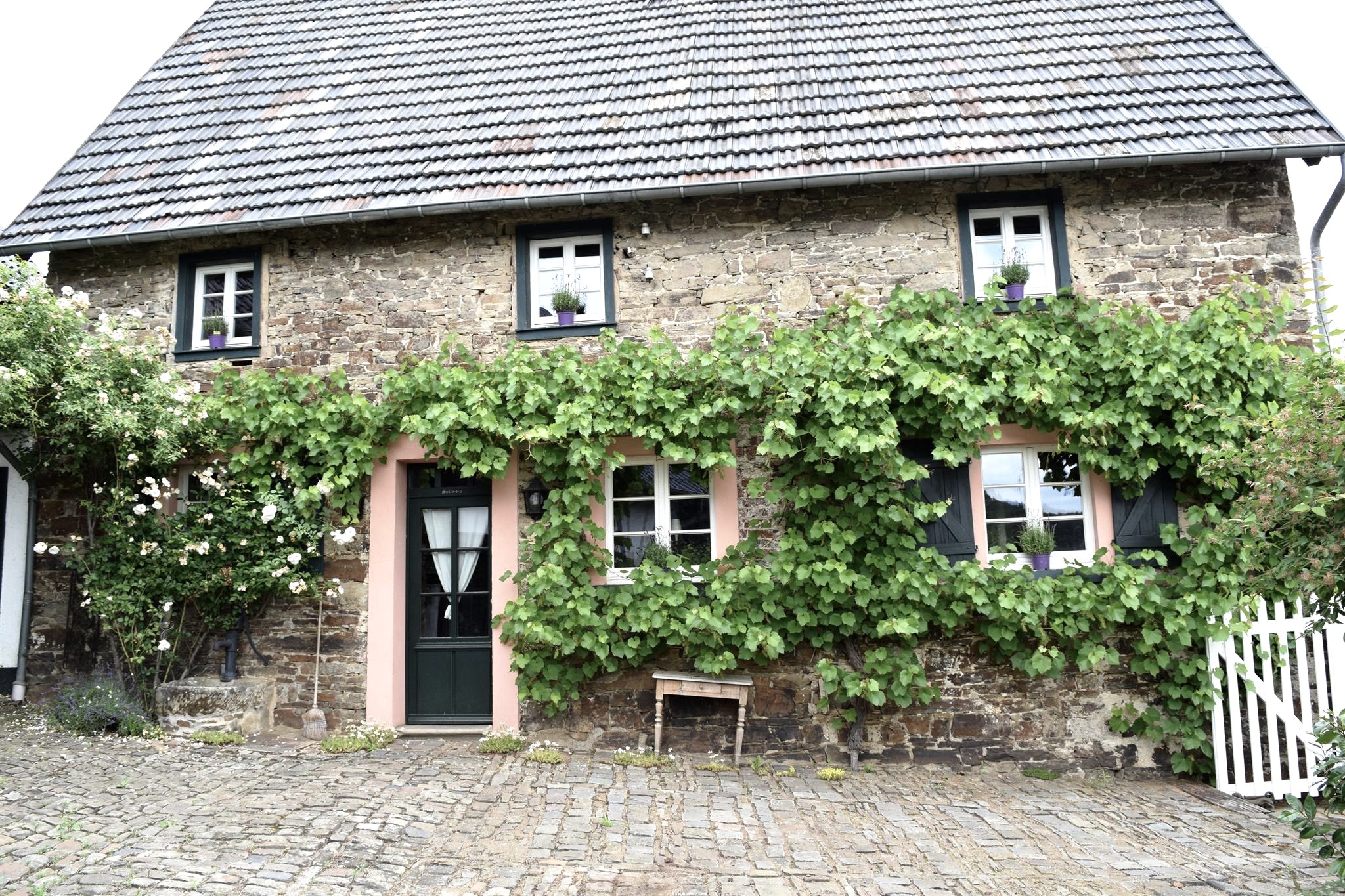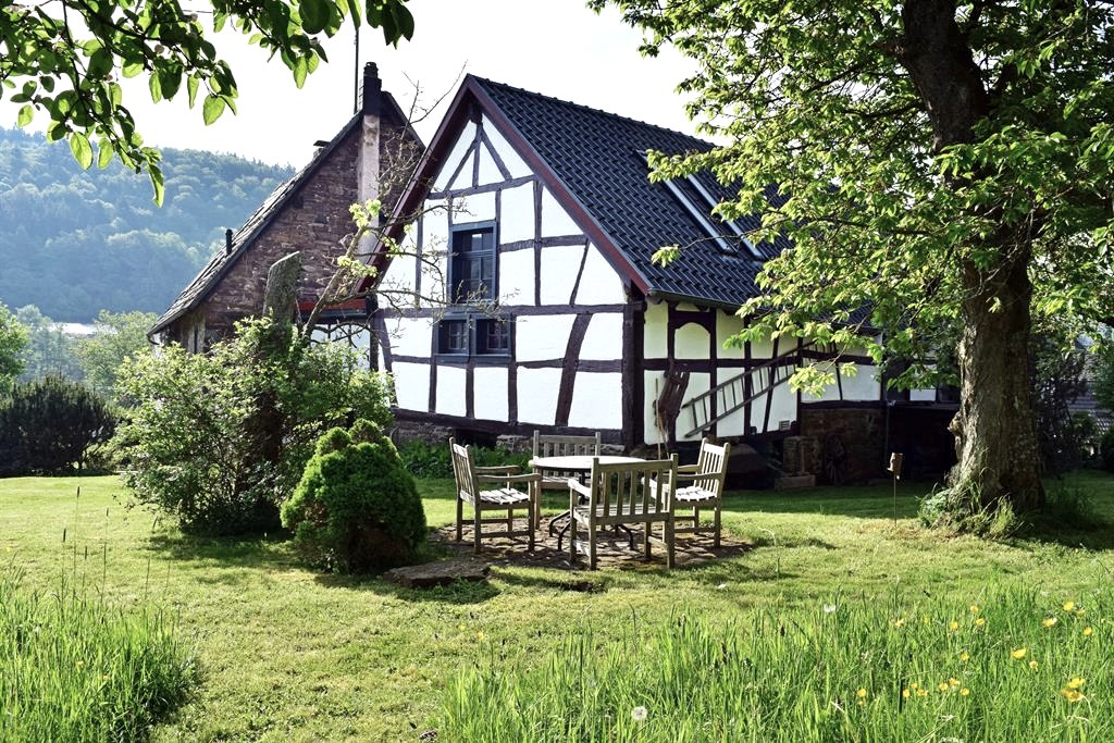 Wie für viele Menschen aus den Ballungsgebieten im Rheinland lag es auch für die beiden Bank-Angestellten Rolf und Stephanie Pannhausen nah, zur Wochenenderholung in die Eifel zu fahren. Seit 2014 hatte es ihnen vor allem der Charme des Ahrtals angetan: Weingenuss und Burgen, Wälder und ganz viel Freiraum zum Wandern, Spazierengehen, Entdecken. Rolf Pannhausen war über seine Eltern, die ein Wochenendhaus in der Eifel hatten, bereits mit der Eifel verbunden… eine Zuneigung aus Kindertagen, welche die Jahrzehnte überdauerte. „Wir dachten zunächst, dass ein eigenes Domizil für Wochenendaufenthalte für uns ebenso das Richtige sei“, erzählt Rolf Pannhausen, der in Düsseldorf aufwuchs, dort in einer Bank Karriere machte und seine aus dem Spreewald stammende Ehefrau Stephanie kennen lernte. Kurzum: Das Paar mit kleiner Tochter war fest in der nordrhein-westfälischen Landeshauptstadt verwurzelt. Und doch: „Nach jedem Eifelurlaub war uns die Großstadt ein Stück fremder. Als wir das im 18. Jahrhundert erbaute Ensemble in der Dorfmitte von Antweiler fanden, war es Liebe auf den ersten Blick. Wir entschlossen uns, es zu kaufen und in Ferienwohnungen umzuwandeln.“ Entstanden ist ein Paradies aus Bruchstein und Fachwerk, mit weitläufigem Garten und altem Baumbestand, das Interieur atmet niveauvollen Landhausstil mit vielen originalen Details. Die Ecolabel-Zertifizierung der drei Gästewohnungen mit dem Namen „Landhaus am Aremberg“ passt konsequent zum Schutz der Natur, die ringsum erlebbar ist.