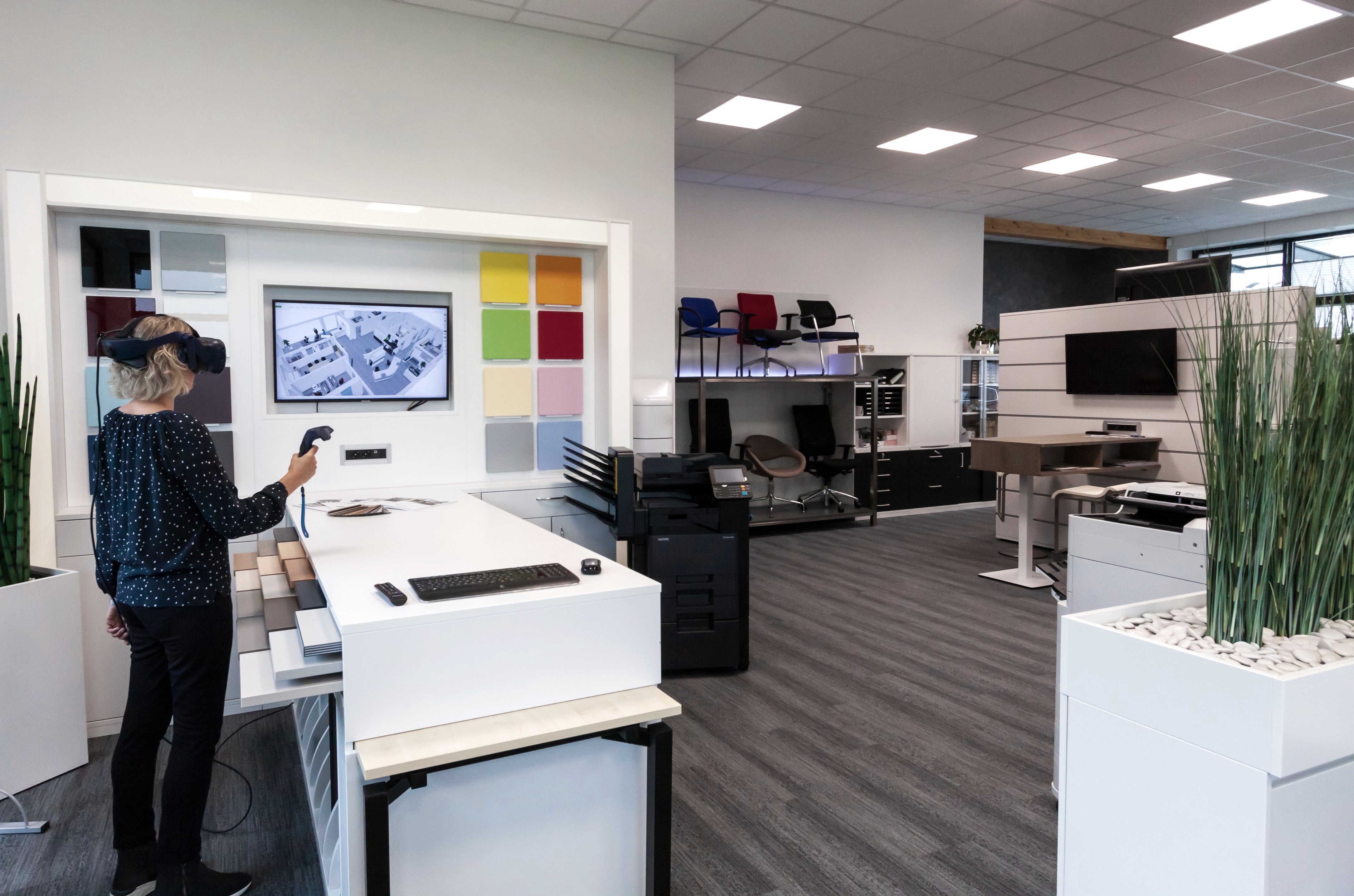 Damit der Kunde sein künftiges Büro bereits während der Planungsphase in den Rundumblick nehmen kann, lädt die Bürowelt seine Kunden zur 3D-Besichtigung in den eigenen Showroom mit Virtuell-Reality-Rundgang ein. Hier sieht der Interessent genau, wo welches Möbelstück stehen könnte, wie die Ausstattung wirkt und letztendlich, ob das seinen Vorstellungen entspricht.