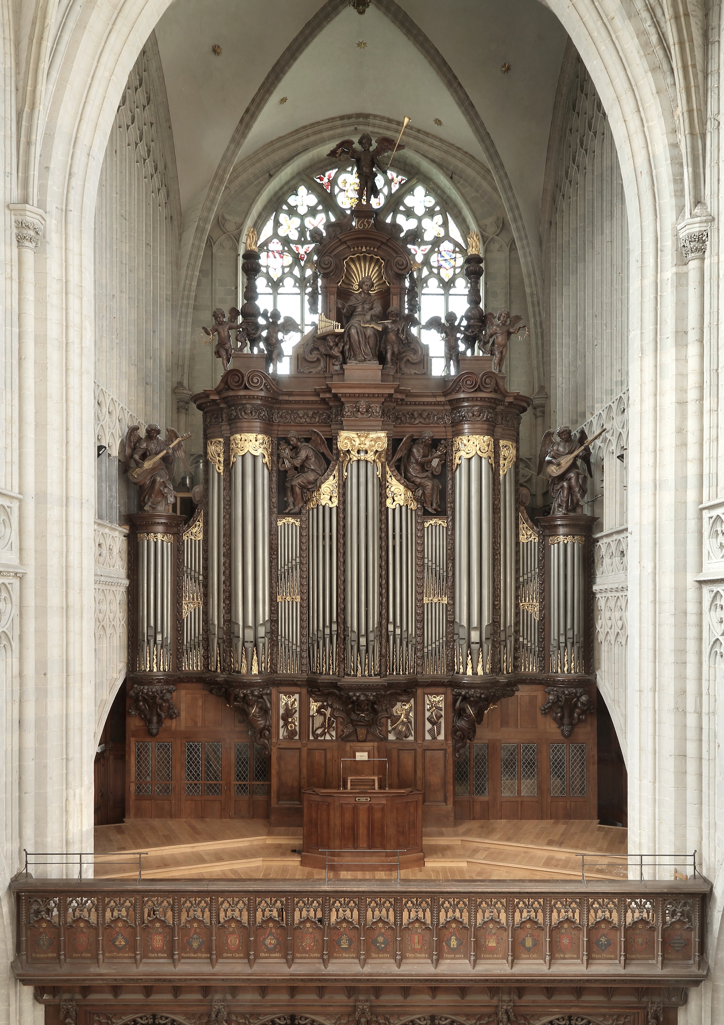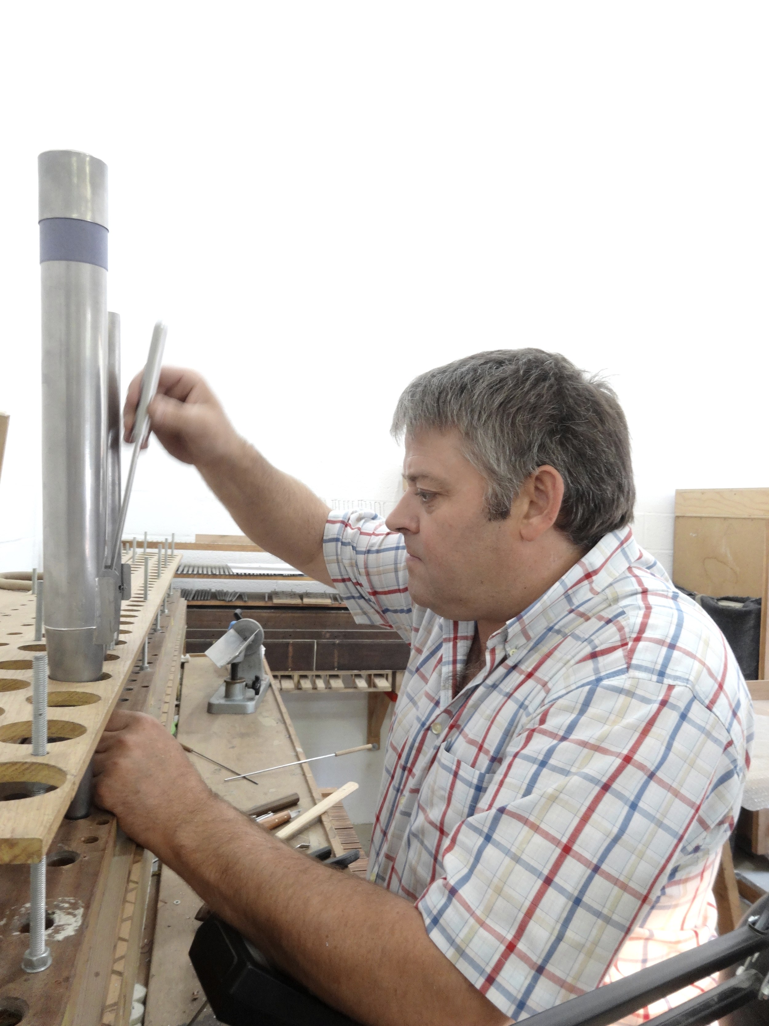 Das nächste Objekt dieser Klasse steht bereits in der hellen, modern ausgestatteten Werkstatt im Langesthal bei Eupen: die wichtigste Orgel der Kathedrale von Brügge. Die kunstvoll geschnitzten Aufsätze und Figuren werden in unendlich vielen Stunden von Anstrichen befreit und in die originale Schönheit zurückversetzt. Das prachtvolle Instrument erhält ein neues Innenleben aus unzähligen, hölzernen beziehungsweise metallenen Einzelteilen. Manche sind sehr filigran, andere imposant… alles ist millimetergenau aufeinander abgestimmt. Die Teile entstehen in der eigenen Werkstatt aus Rohstoffen, die Fertigungstiefe ist enorm. Das Lager beherbergt zudem Teile von abgebauten Orgeln, um Restaurierungen möglichst originalgetreu ausführen zu können. „Keine Orgel ist wie die andere, jede ist eingebettet in eine unverwechselbare Geschichte an einem bestimmten Ort, in einer bestimmten Region, in einer musikalischen und architektonischen Stilepoche“, schildert Guido Schumacher die Komplexität der Instrumente. Die Auswahl der Hölzer oder die Mischung der Blei-Zinn-Legierung verraten, wo eine historische Orgel ursprünglich entstand. Entsprechend vielfältig ist der Lehrberuf. „Es braucht noch mindestens fünf Jahre Erfahrung, bis man nach absolvierter Prüfung selbstständig arbeiten kann.“ In einer einzigen Orgel stecken zigtausende Arbeitsstunden.