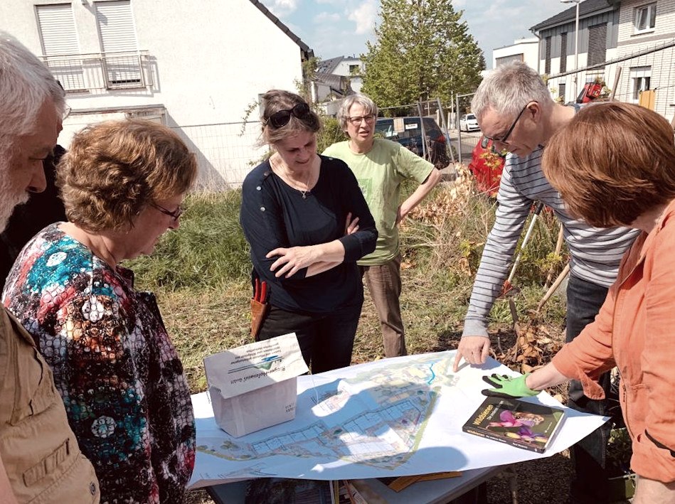 Mit 30.000 qm ist das Gelände groß, beinhaltet sogar ein kleines Wäldchen und es können noch einige Wohngebäude entstehen. Noch sind nicht alle geplanten Bauflächen bebaut, doch die ersten Bewohnerinnen und Bewohner haben schon ihre Wohnungen bezogen. Sie genießen das gemeinschaftliche Leben, ohne auf ihre eigene vier Wände verzichten zu müssen. Der PrymPark ist eine Cohousing- und Klimaschutzsiedlung mitten in Düren. Das Gelände gehört der Evangelischen Gemeinde zu Düren und für die Umsetzung hat sie die PrymPark-Quartiersgesellschaft mbH gegründet. Die Baugrundstücke werden im Erbbaurecht an Baugemeinschaften verpachtet. Haben sich genügend Personen zu einer Baugemeinschaft gefunden, geht es an die Planung. Dafür steht in Form einer Prozessbegleitung und einem Architektenteam professionelle Hilfe zur Seite. Ursula Enderichs-Holzapfel ist bei der Quartiersgesellschaft tätig, bringt Interessierte zusammen und unterstützt beim Aufbau der Organisationsstruktur, denn die Gemeinschaftsräume und das Grundstück mit Wegen und Gärten müssen gemeinschaftlich verwaltet werden.
