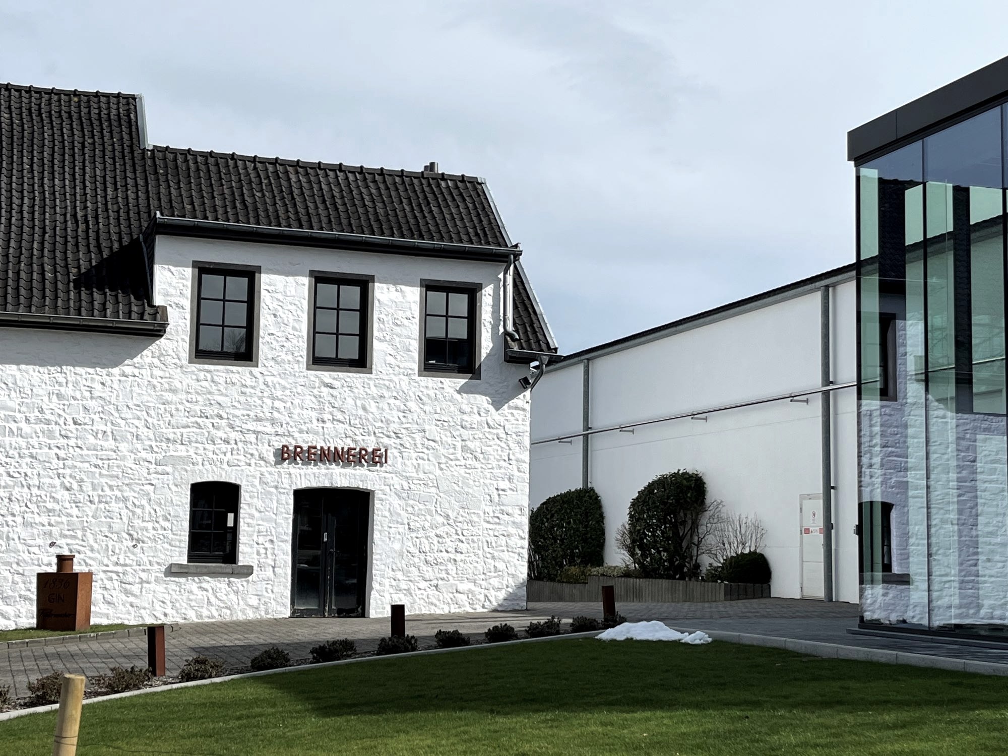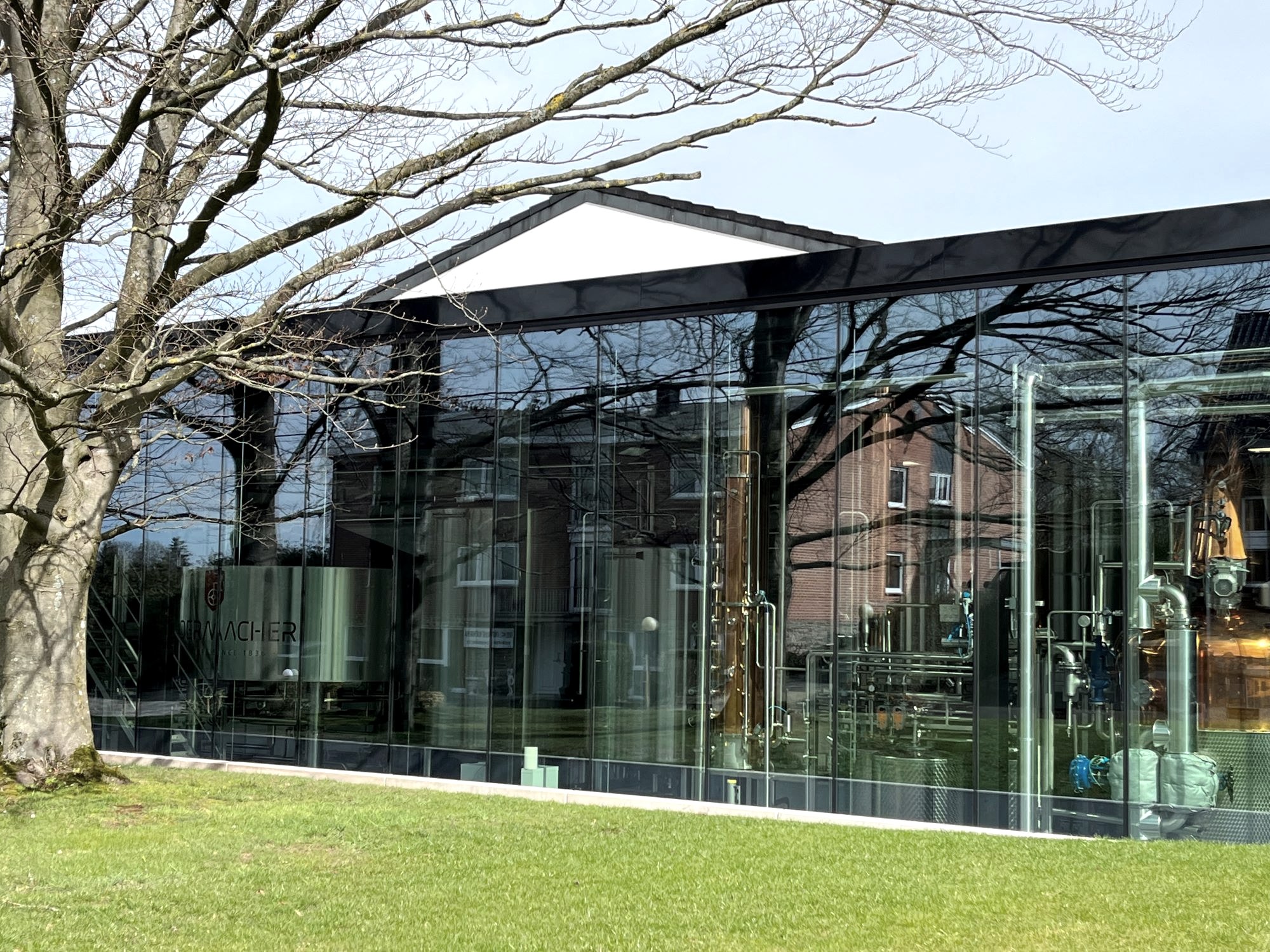 Die älteste Brennerei Belgiens liegt im kleinen Grenzort Raeren bei Aachen, mitten im Idyll sanft gewellter Hügellandschaft. Das weiß gekalkte, aus massiven Bruchsteinen errichtete Haus der Gründerfamilie Radermacher, deren Nachkommen fünf Generationen später noch hier leben und arbeiten, erinnert an die Beginenhöfe des Mittelalters. Ein harmonisch-gelungener Kontrast zum rustikalen Hof ist gleich nebenan ein minimalistisches gläsernes Gebäude, in dem gut sichtbar imposante Kupferkessel schimmern. Drinnen duftet es dezent und deutlich zugleich nach feinem Hochprozentigem. Hier wird Getreide frisch gemahlen, gemaischt, destilliert. In einem Nachbarraum befindet sich das Herzstück des „Gesamtkunstwerks“ von insgesamt mehr als siebzig verschiedenen Produkten: Bis zu 600 verschiedene Aromen, Kräuter und Gewürze werden nach eigenen Rezepturen hinzugemischt. Auch die Qualitätskontrolle, Abfüllung, Verpackung und Lagerung bis zum Transport geschieht im hoch modernen Trakt. „Die Präzision der Arbeitsschritte ist das A und O“, erläutert Bernard Zacharias die beeindruckende Atmosphäre zwischen Manufaktur und Hightech.