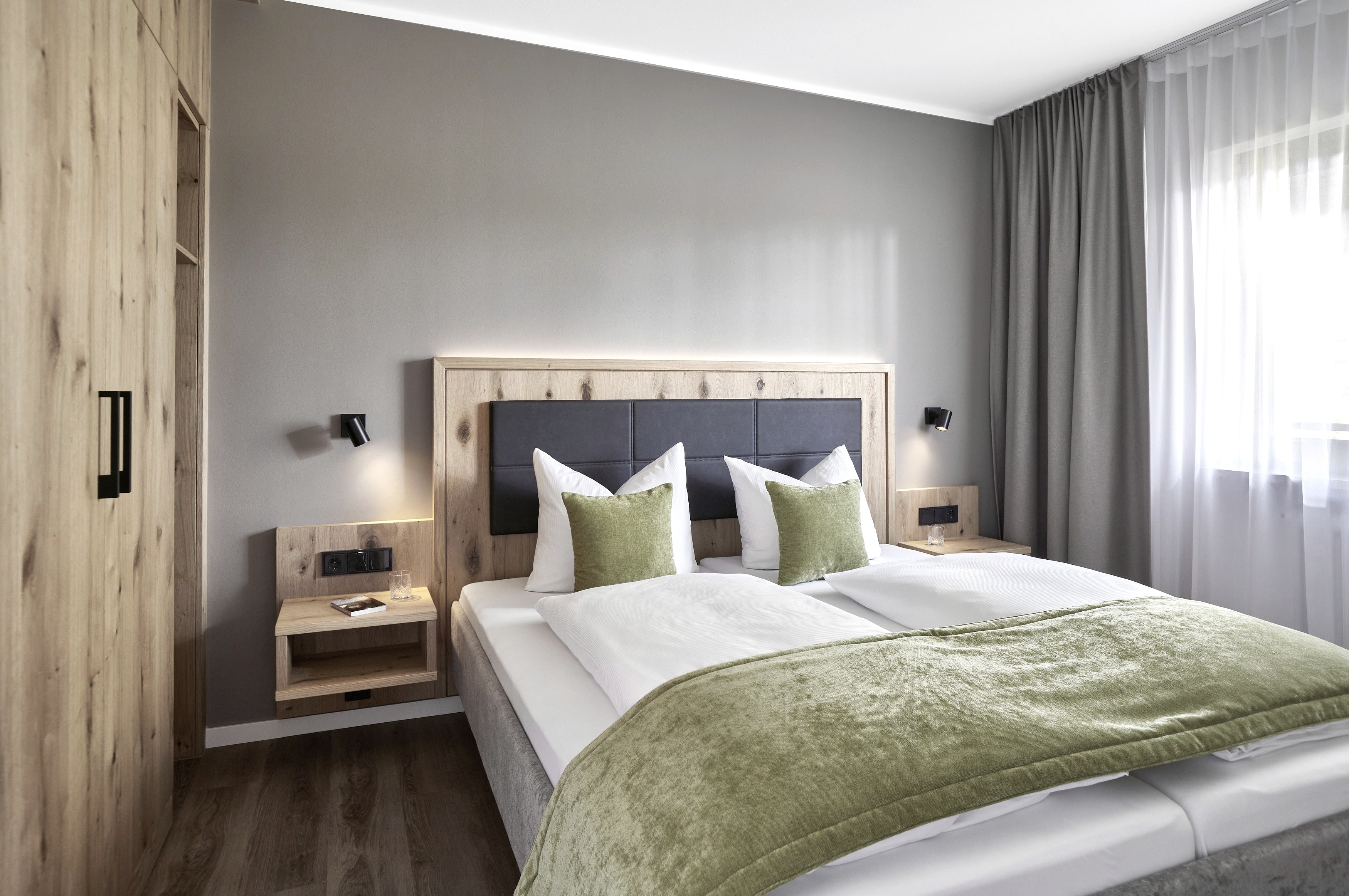 Das Konzept des Sporthotels Grafenwald ist in der Tat für die Region unverwechselbar. Neben den hochqualitativen, robust ausgestatteten Ferienbungalows, in denen sich gern Familien mit Kindern und auf Wunsch auch mit Haustieren wohlfühlen, setzt der Hoteltrakt nämlich auf außergewöhnliches Niveau. Von den insgesamt 34 jüngst renovierten Zimmern sind drei geräumige Wellness-Suiten mit Infrarotkabine, Erlebnisdusche, Betten mit Waldblick, großformatigen Fernsehern, LED-Kamin und mehr. Auch die übrigen 24 Komfort-Suiten-Deluxe haben vom übrigen Bereich separate Schlafzimmer. Es gibt so genannte Schnarcherzimmer mit zwei durch eine Tür getrennten Schlafbereichen. Allen ist eines gemeinsam: Die Materialien wie etwa massive Eiche sind edel, das individuelle Design ist modern und zugleich eifeltypisch mit künstlerischen Fotografien an den Wänden, die den Bezug zur Ferienlandschaft herstellen.