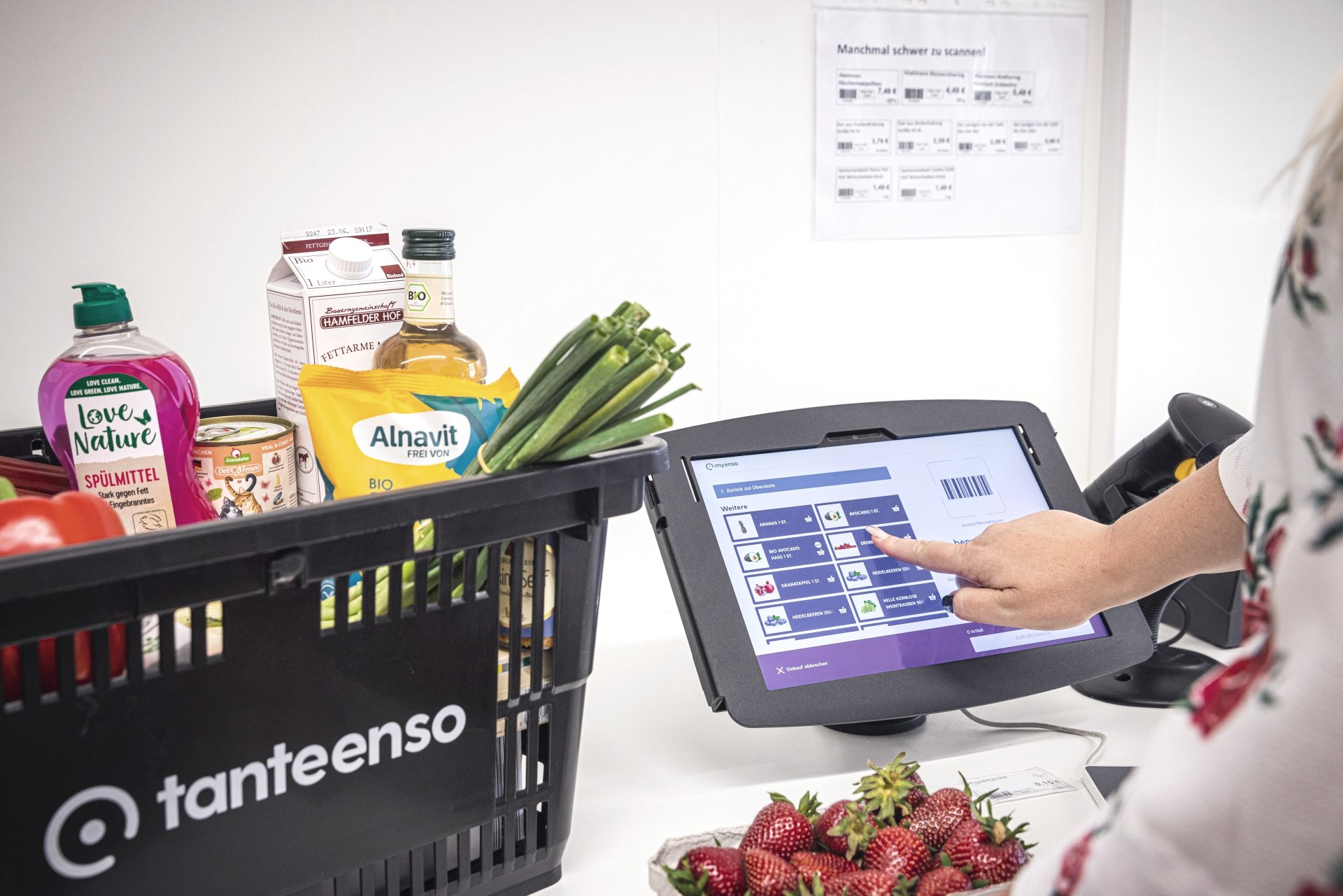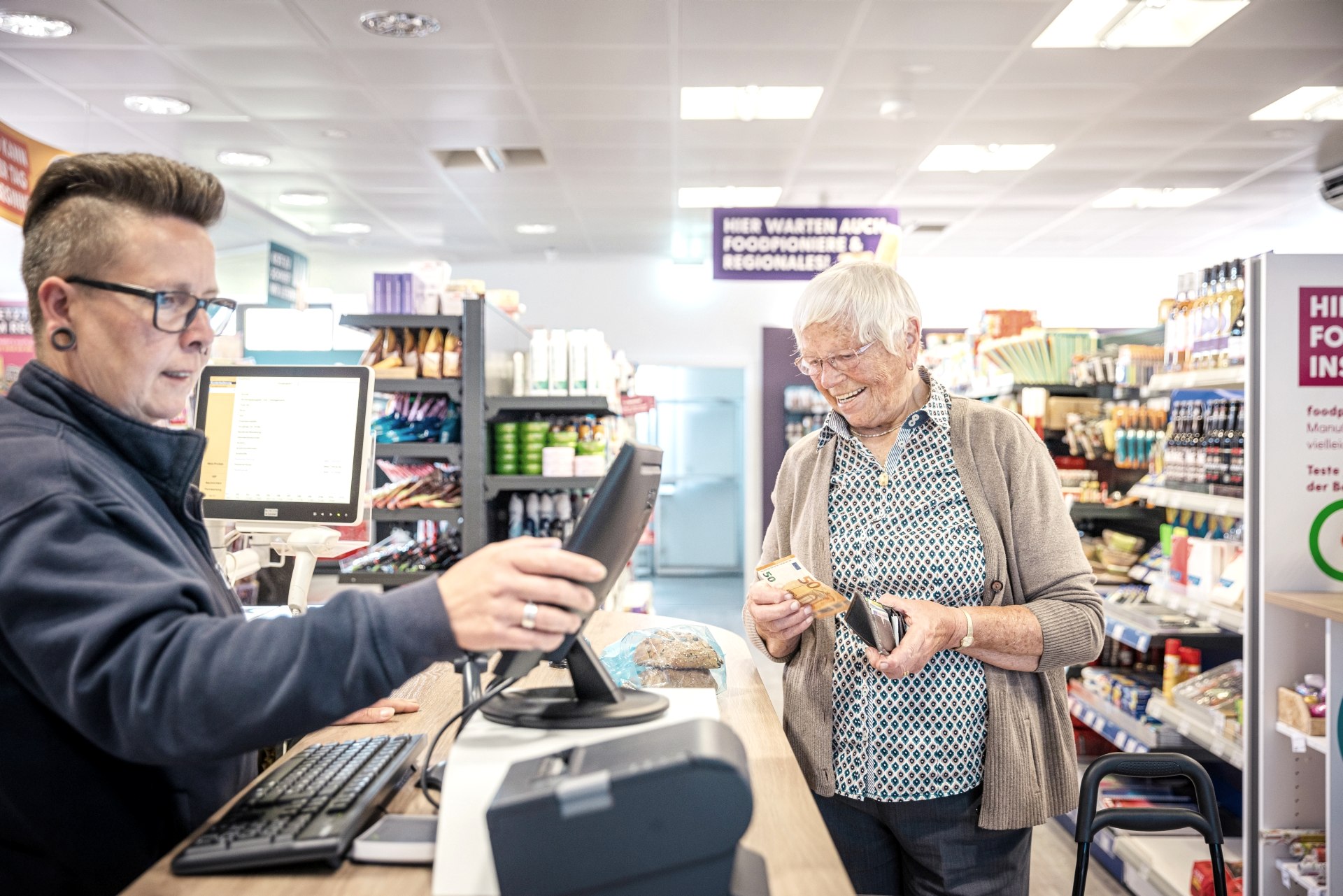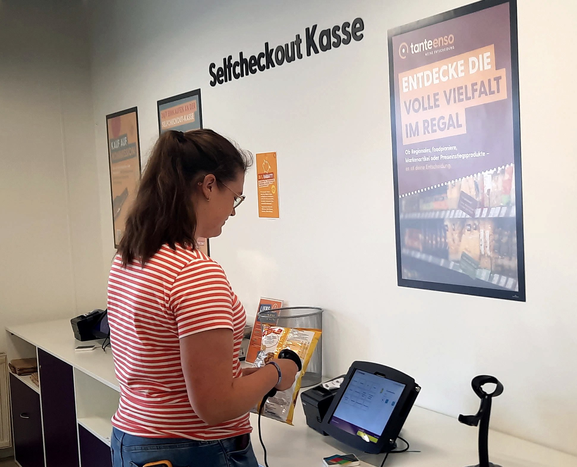 Tante Enso revolutioniert das Einkaufen in ländlichen Gemeinden. Während sich die klassischen Versorger vielerorts zurückziehen, eröffnet Tante Enso zur Zeit mehrfach im Monat einen neuen Markt in Deutschland. „Zu den Pluspunkten zählt sicherlich auch, dass man bei uns rund um die Uhr und auch am Wochenende einkaufen kann“, so Regionalleiterin Regina Klein. Möglich macht das die Kundenkarte, mit der man stetig Zutritt zum Laden hat und an einer Selfcheckout-Kasse zahlt. Was nicht bedeutet, dass der persönliche Kontakt zu kurz kommt – im Gegenteil. Zu den personalbesetzten Zeiten ist immer eine der vier Teilzeitkräfte oder eine der Schüleraushilfen da. Und wie zu Tante Emmas Zeiten kennt man sich persönlich, schließlich kommen fast alle aus dem Ort. „Und man kann Eifeler Platt mit uns sprechen. Zeit für einen kleinen Plausch ist bei uns immer da“, so Lehnertz, die wie ihre Kolleginnen als junge Mutter die familienfreundlichen Arbeitsbedingungen sehr zu schätzen weiß.