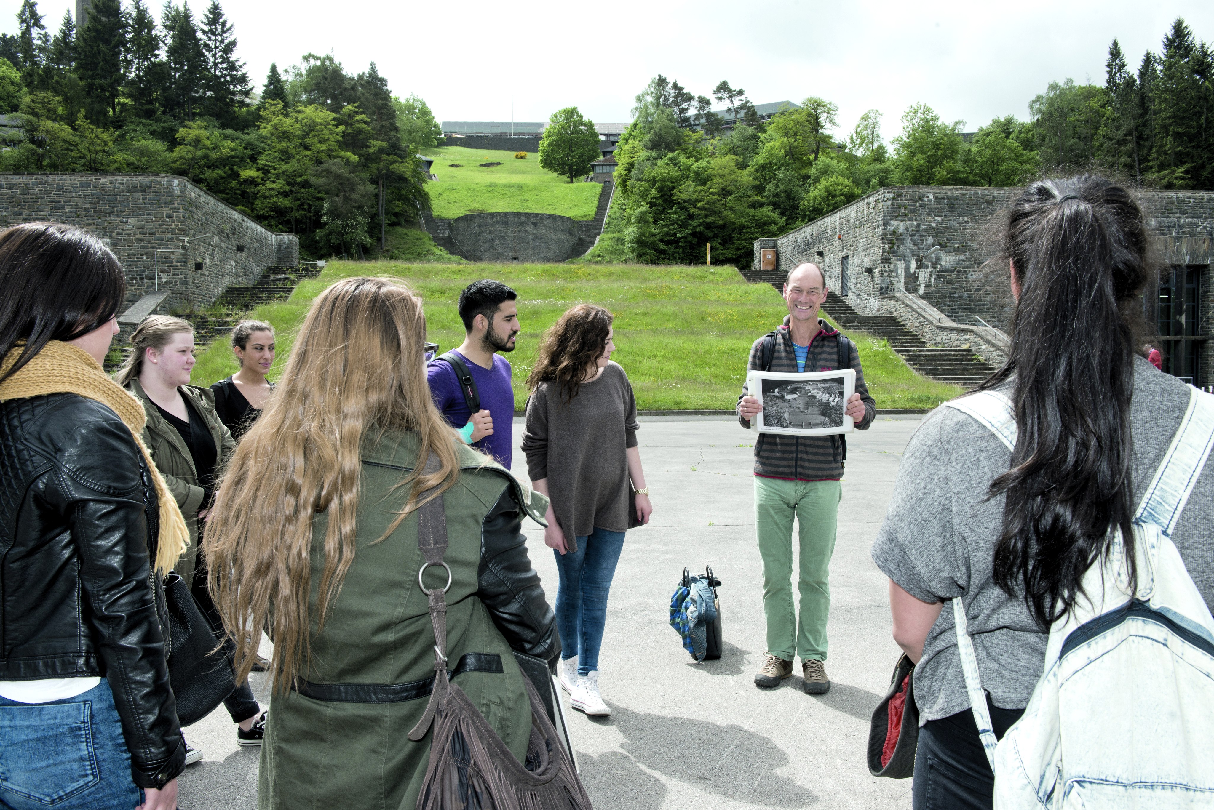 Das ist einer der Ansprüche von Vogelsang IP: Die Verbindung zwischen Vergangenheit und Gegenwart zu schaffen. Was hat das NS-Regime mit der heutigen Zeit zu tun? Was bedeutet Rassismus damals und was heute? Die Jugendbildung ist dabei ein großer Baustein im Bildungsangebot. Spezielle Führungen für Schulklassen, Projekttage, Studientage – Für die Klassenstufen der Sek I und Sek II stehen unterschiedliche Formate zur Verfügung, die rege genutzt werden. Doch auch für die Erwachsenen stehen neben den Führungen weitergehende Angebote - ähnlich wie für die Jugendlichen - zur Verfügung. „Wir wollen möglichst alle Zielgruppen mitnehmen und ansprechen“, betont Petra Kleen. Daher wird das Angebot auch immer weiter ausgebaut. Neu ist beispielsweise eine Führung im Kleinbus für mobilitätseingeschränkte Besucher. Regelmäßig kommen auch von der Bundeswehr, der Polizei oder dem Zoll Gruppen an diesen geschichtsträchtigen Ort. Wünschen Gruppen mehr als eine Führung über das Gelände, können sie die umfangreichen Seminarräume nutzen und sich ein Programm von den Mitarbeitern auf Vogelsang IP maßschneidern lassen.