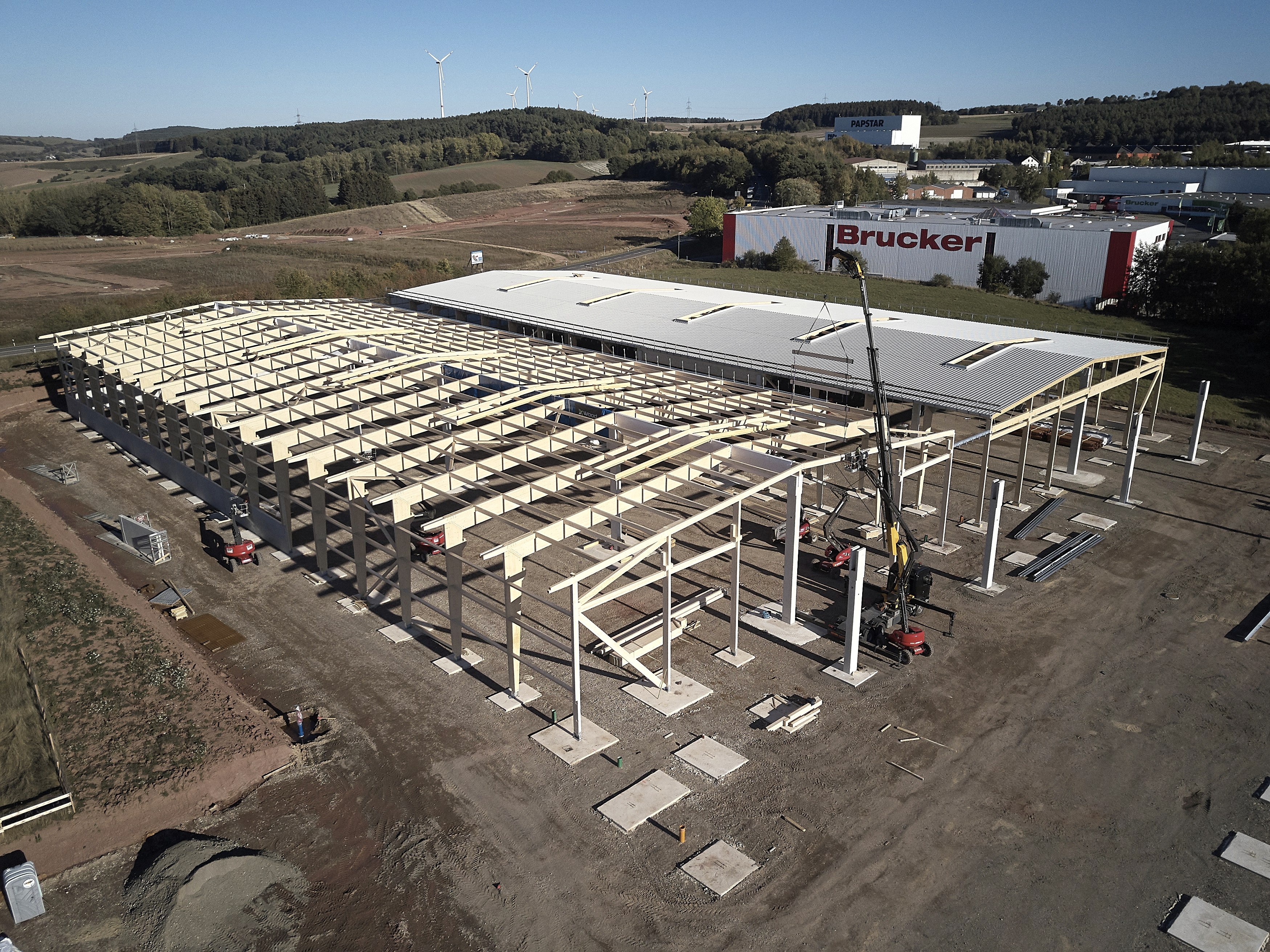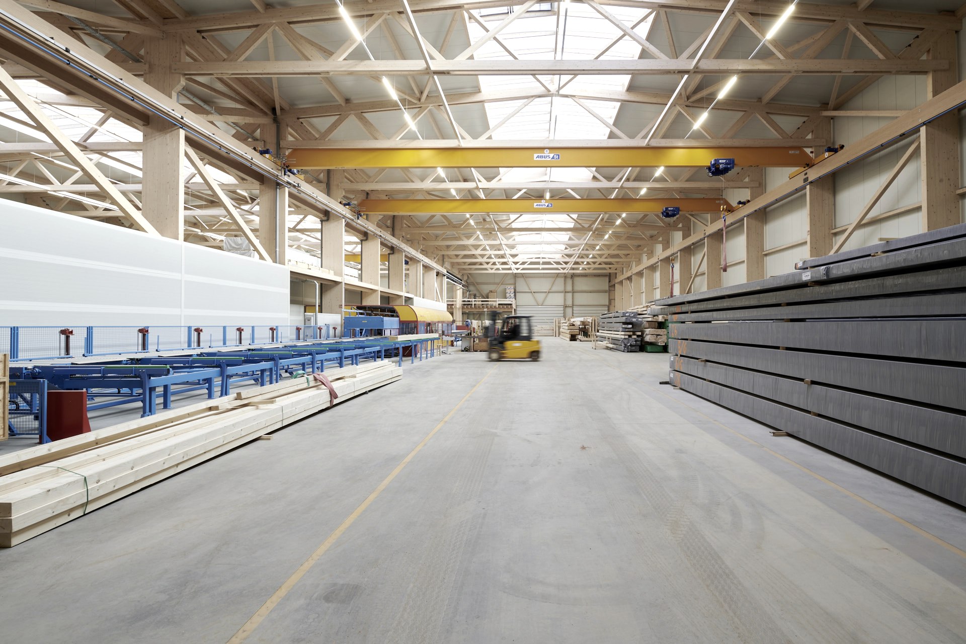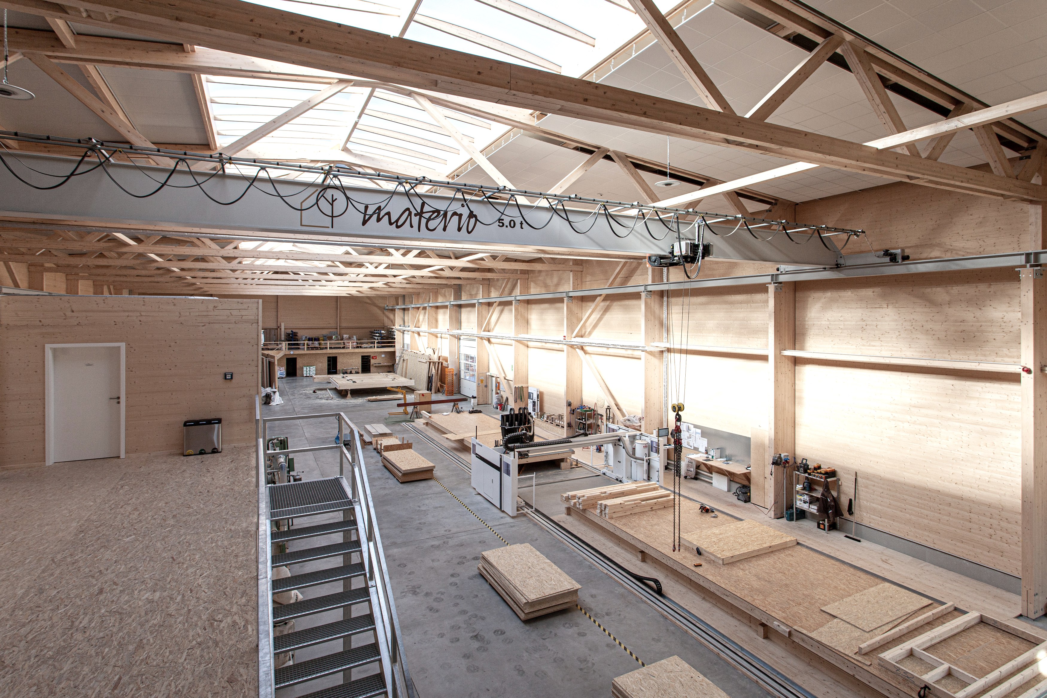 Die Fertigungshalle in Kall ist für Kunden das beste Beispiel, wie eine Produktionshalle in Holzbauweise aussehen kann. Die Halle ist durch gleich zwei 70 m-lange Lichtfirste selbst bei bewölktem Himmel taghell und es gibt eine Bodenheizung, die mit den eigenen Holzresten betrieben wird.