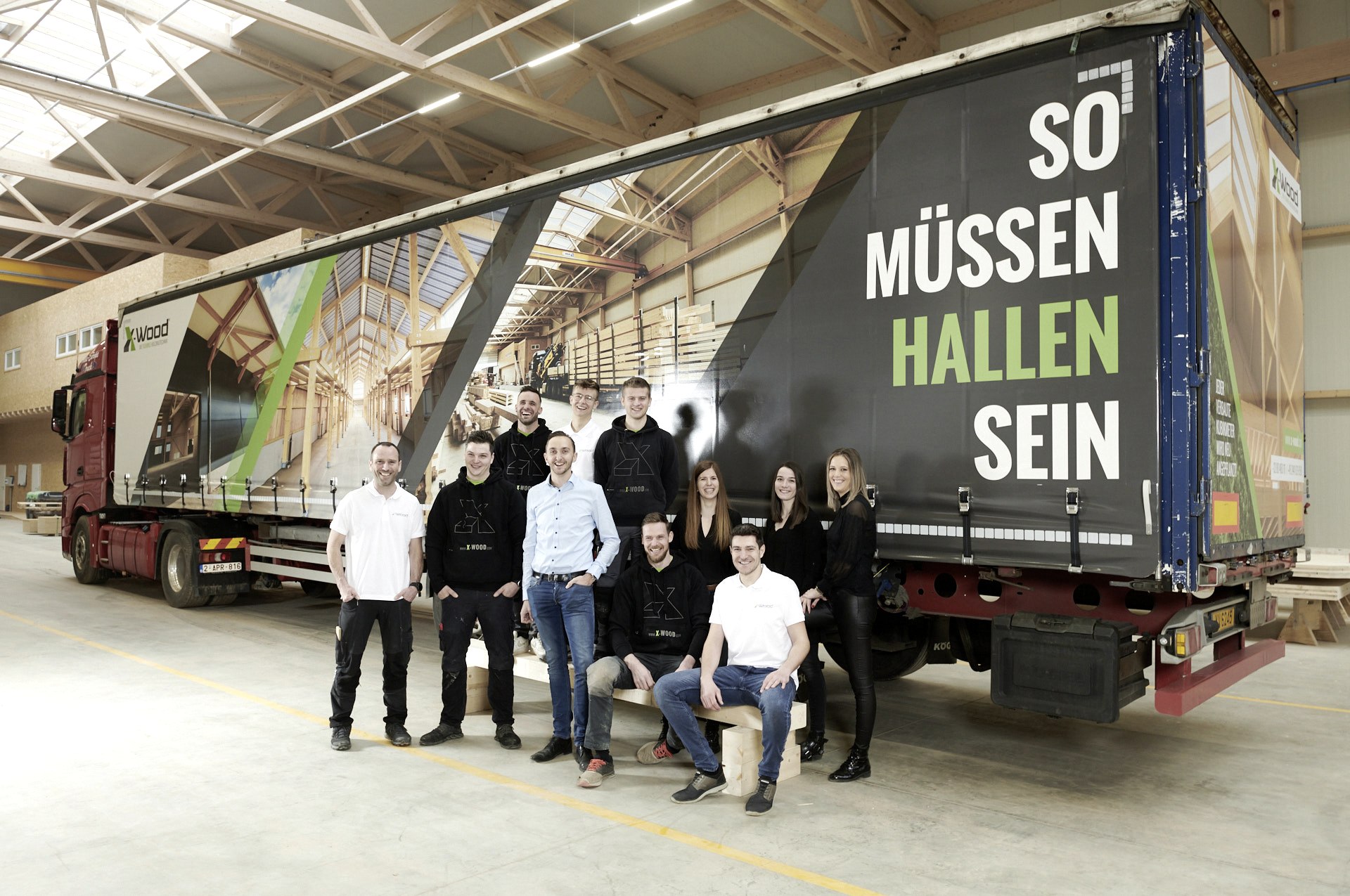 X-Wood® setzt bei dem Bau der Holzhallen auf eigenes Montagepersonal, da nur so die Qualität in der Ausführung für die Kunden gewährleistet werden kann. Die bisher größte Halle, die X-Wood® produziert hat, war 14.000 Quadratmeter groß – aufgebaut von vier Mitarbeitern.
