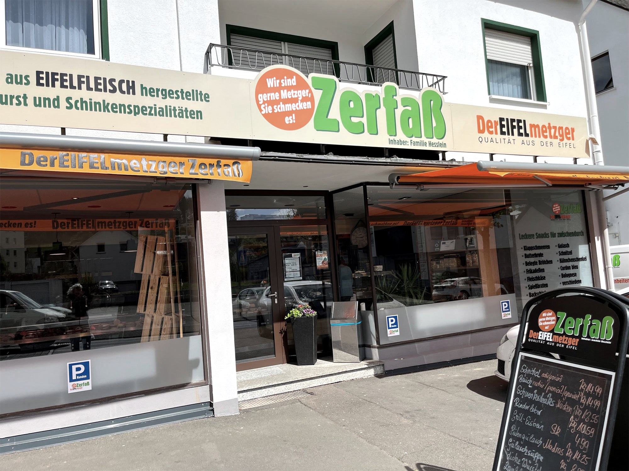 Gabriele Hesslein, Tochter des Firmengründers Zerfaß und selbst passionierte Metzgerin, verbindet gemeinsam mit ihrem Ehemann Joachim und Sohn Andreas als Familienbetrieb auf tatkräftige Weise die Qualität des auf Feinkost spezialisierten Fleischerhandwerks mit einem Gespür für das, was moderne Menschen lieben. Stillstand gibt es im Unternehmen nicht, auch wenn der angestammte Firmensitz im kleinen Eifeldorf Deudesfeld, nicht weit vom Meerfelder Maar, der Kern geblieben ist. Die Hessleins haben Filialen in Daun und in Ulmen, jeweils in fußläufiger Nähe zu Supermärkten, Bäckereien und oder sonstiger städtischer Infrastruktur. „Es kommt darauf an, leicht erreichbar und gut sichtbar zu sein. Dann können die Kunden ihre täglichen Einkäufe perfekt mit unserer regionalen Frischequalität verbinden“, schildert Gabriele Hesslein die Vorteile. Als erste Metzgerei trägt der Eifelmetzger Zerfaß das Gütesiegel der Regionalmarke EIFEL und ist damit ein wichtiger Markenbotschafter. Rund neunzig Prozent des Fleisches kommen aus der Eifel. Geschlachtet werden die Tiere bei einem ebenfalls zertifizierten Netzwerkpartner der Regionalmarke.