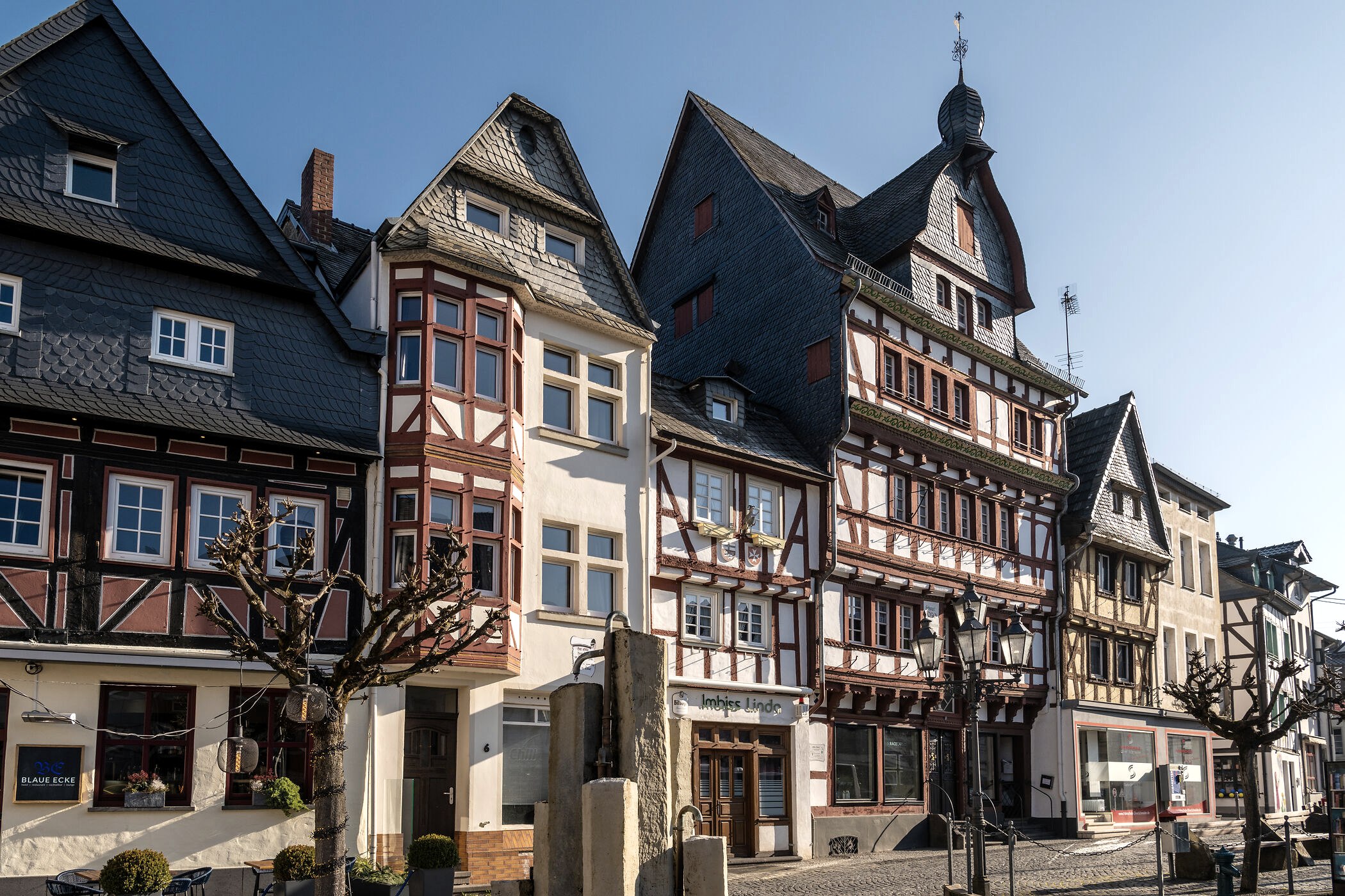Adenau mit seinen rund 3000 Einwohnern ist mehr als nur eine hübsche Bühne für das „Schaulaufen“ von Boliden und Rennsportfans. Abseits der quirligen Hauptstraße wird spürbar, dass auch Romantik hier in der Hohen Eifel ihren Platz hat. Die Fachwerkgiebel – etwa die berühmte Blaue Ecke und ihre prachtvollen Nachbarn – kommen voll zur Geltung. Der Buttermarkt, ein alter Ortskern etwas abseits der heutigen Mitte, versprüht mit Steinbrunnen und schlichterem Fachwerk den ursprünglichen Charme eines beschaulichen Eifeldorfes. Doch natürlich gerät die legendäre Nordschleife, die nur wenige Kilometer entfernt liegt, nicht in Vergessenheit. Dienstleistungen und Sortimente für Motorfans gehören ganzjährig zum Angebot von Adenau.