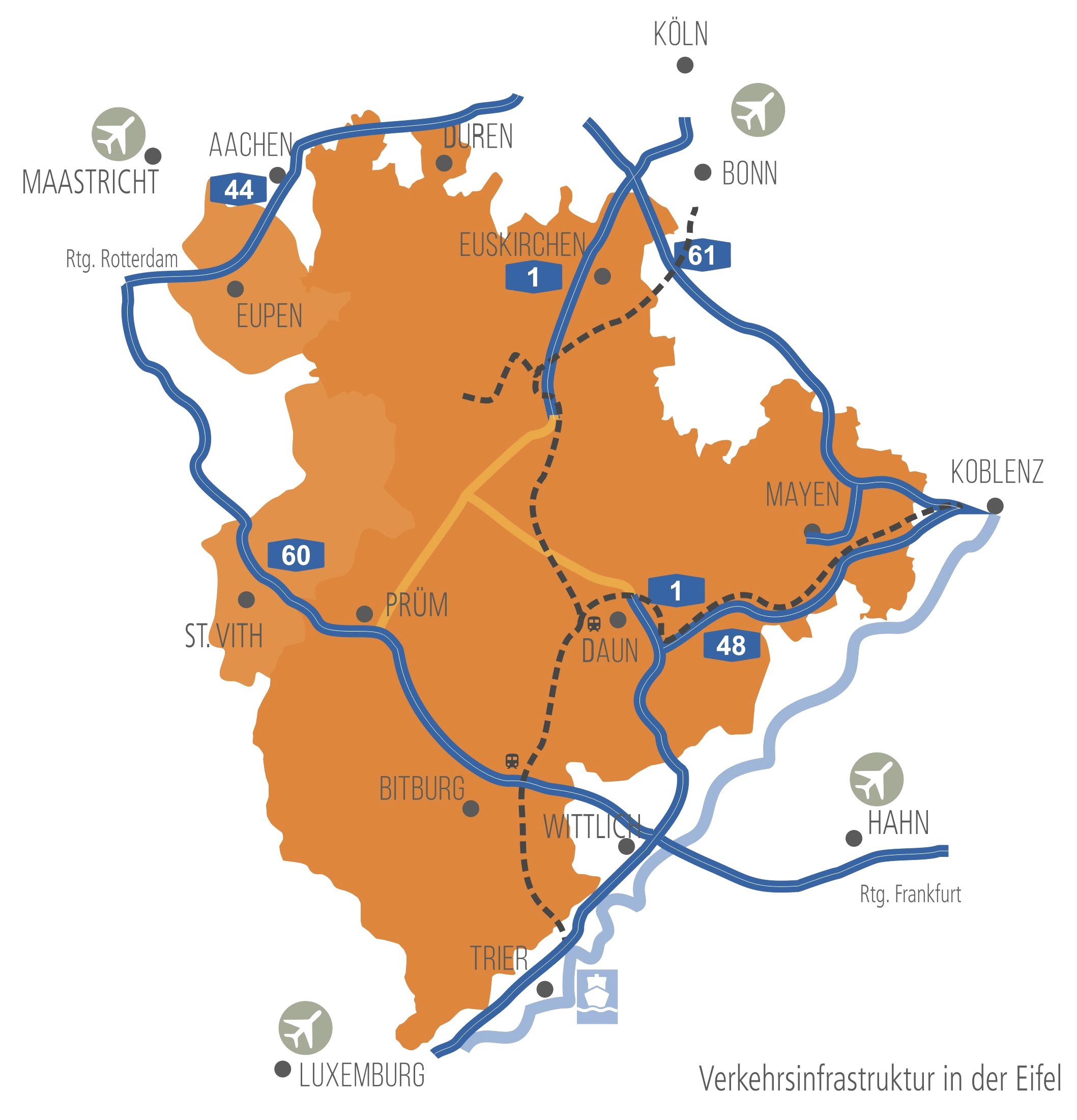 Kelten und Römer prägten die Eifel bis heute mit ihrer Siedlungsstruktur: Etwa alle vierzig Kilometer, eine Tagesreise zu Pferd, entstand eine Stadt. Und die Dörfer sind zwei bis fünf Kilometer voneinander entfernt – ein fußläufiger Spaziergang. Auch heute noch ist alles nah beisammen: der Job, der Wohnort, die Schule, das Shopping.